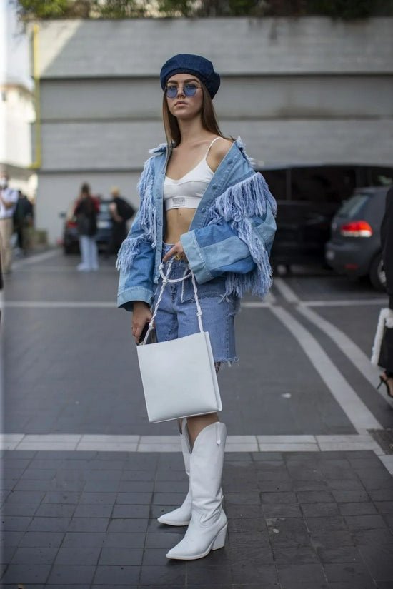 The most seen in street photography is a complete set of denim outfits to create a casual western cowboy style.
