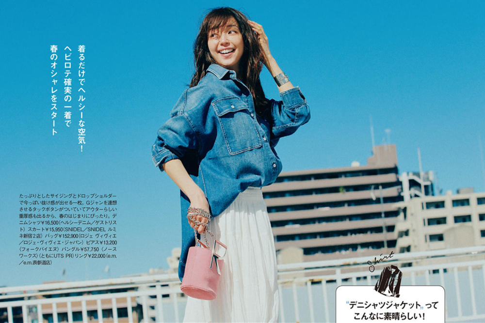 In fact, you can broaden your collocation thinking. In addition to wearing it, you can also carry it. In Japanese miscellaneous, a model has demonstrated it, carrying a yellow mini handbag to add brilliance to the overall look.