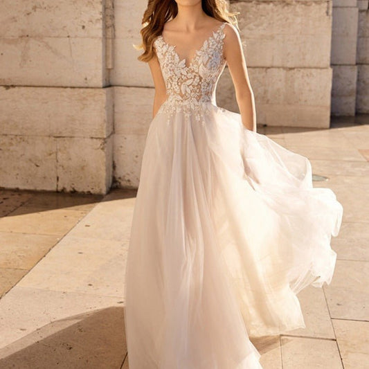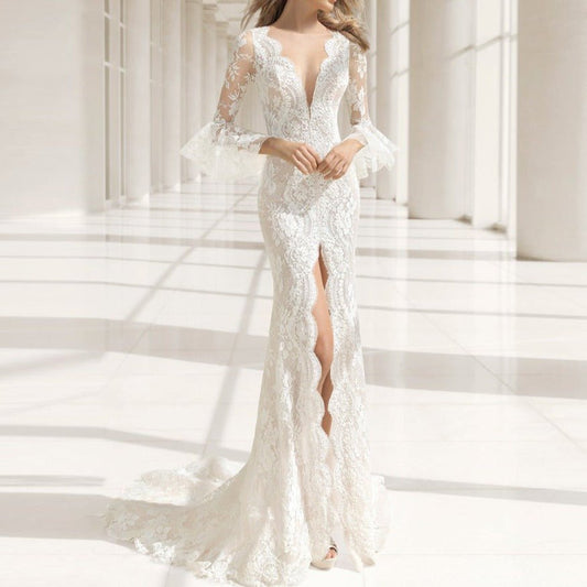 lace deep V-neck slim wedding dress