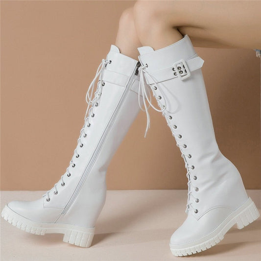 Knee High Military Boots Female Back Lace Up Round Toe Platform Pumps Shoes
