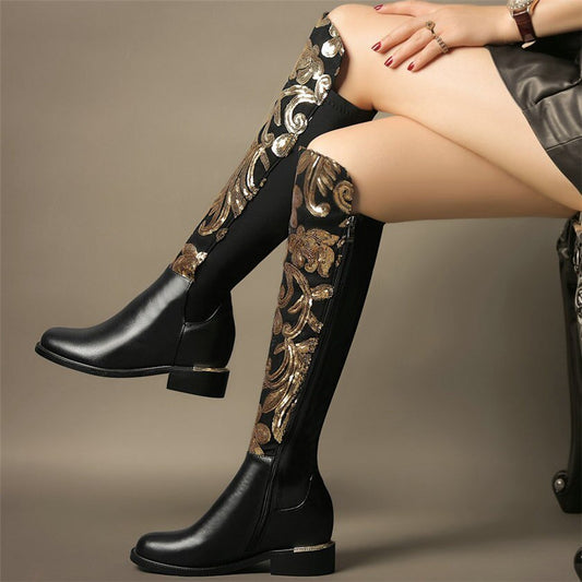 Women Genuine Leather Hidden Wedges High Heel Knee High Boots