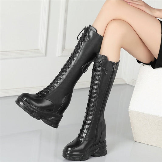 Women Genuine Leather Hidden Wedges Knee High Military Boots Round Toe
