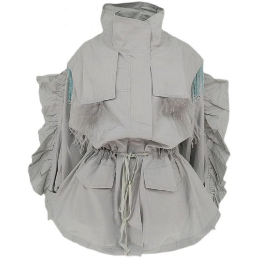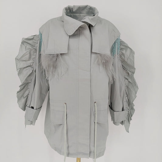Women Trench Coat Tassel Beaded Lantern Sleeve Windbreaker