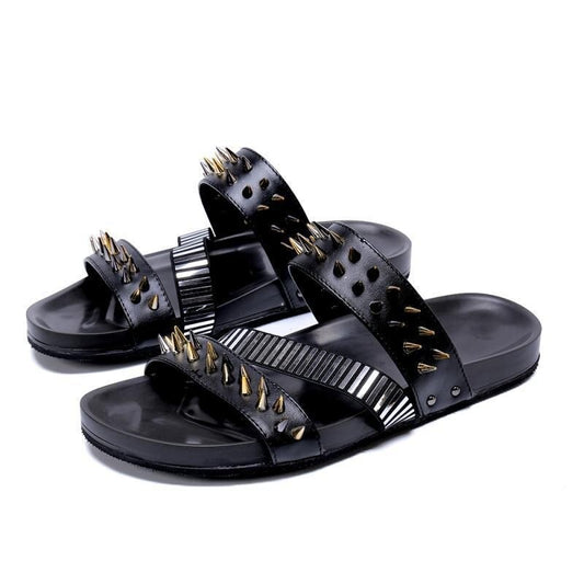 Mens Real Leather Roman Slides Rivet Punk Slippers