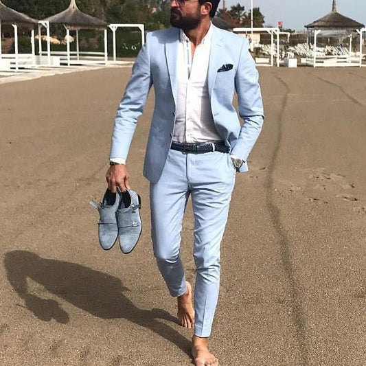 Sky Blue Linen Beach Men Suits Groom Tuxedo for Wedding