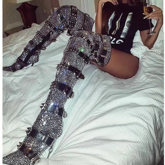 Rhinestone-Embellished Slouchy Knee-High Women Boots