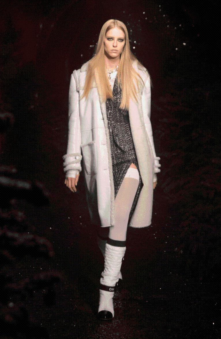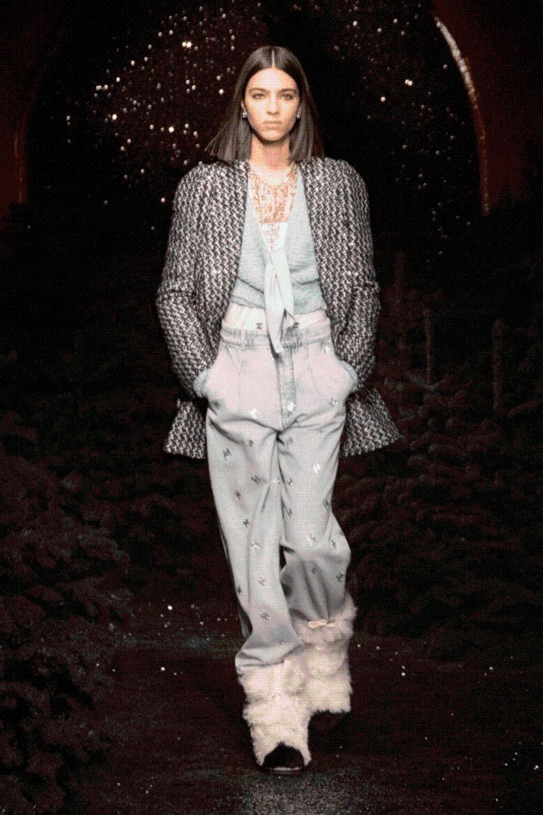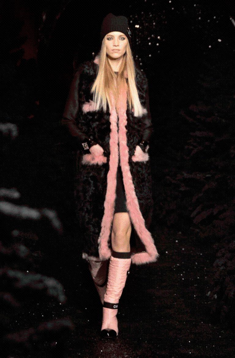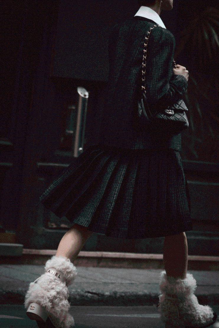 シャネルの2021/22年秋冬プレタポルテコレクションは、山小屋、雪を頂いた山、スキー場など、ウィンタースポーツの楽しさを讃えています。ロングスノーブーツはブラックとホワイトの3色展開で、ふわふわの素材は二重構造になっています。大きな外側の皮を外すと、その下にあるブランドの特徴的なレザーショートブーツが現れます。