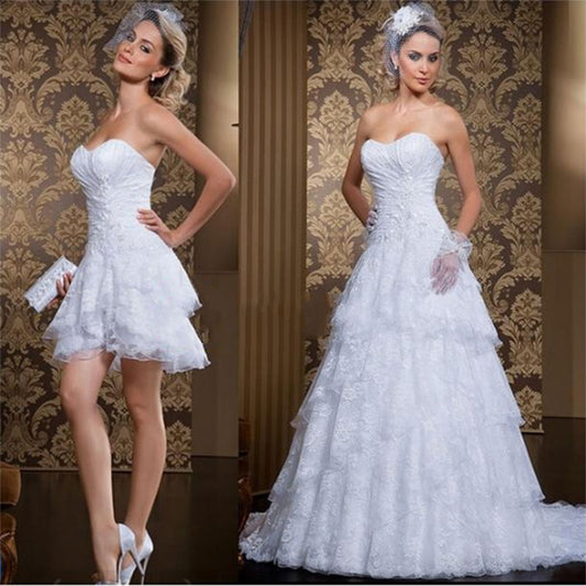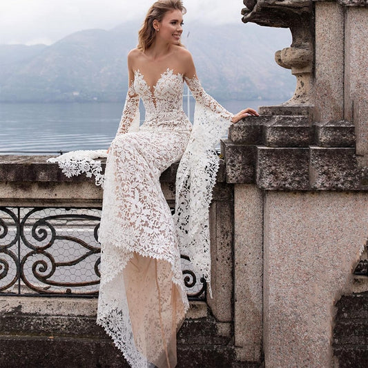 取り外し可能なトレーン付きロングスリーブ リボン アップリケ レース マーメイド ウェディングドレス