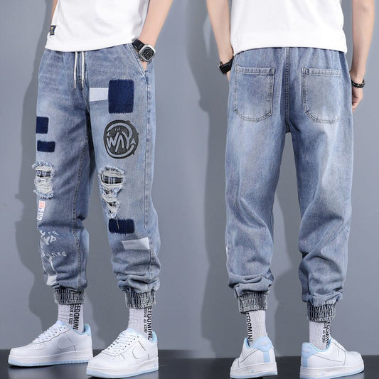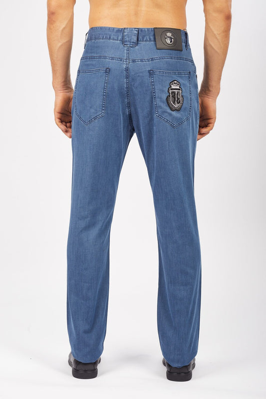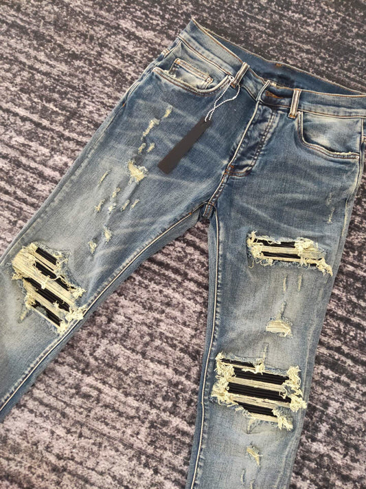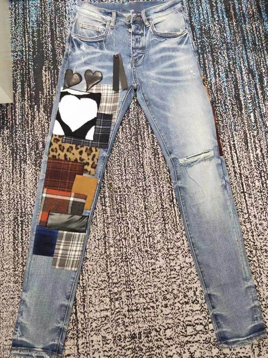 メンズ アート パッチ ダメージ加工 ブルー ジーンズ