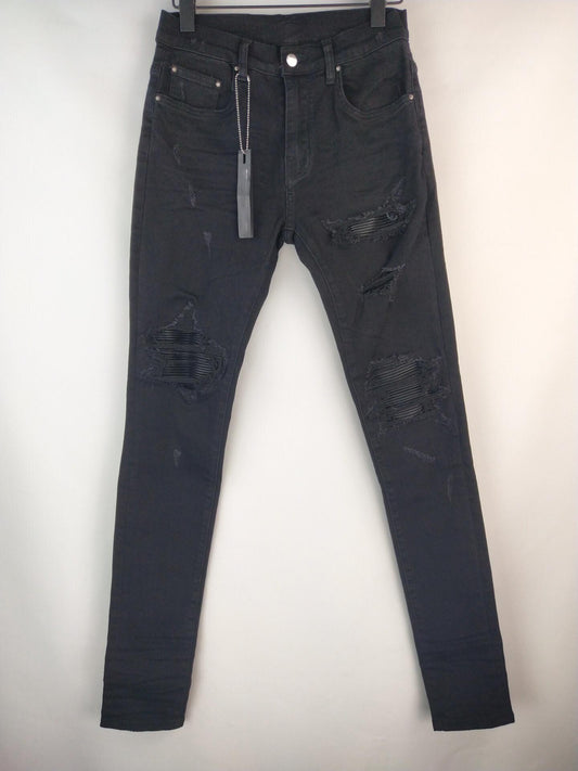 メンズ ストレッチ スキニー リブ パッチ ディストレスト ブラック ジーンズ