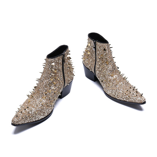 ファッションデザイナー本革メンズアンクルブーツゴールドリベットショートブーツ男性パーティーウェディングドレスシューズプラスサイズ