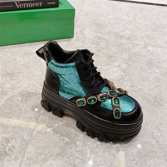 牛革カラーマッチングカラーレースアップパールラインストーンチェーンスニーカー