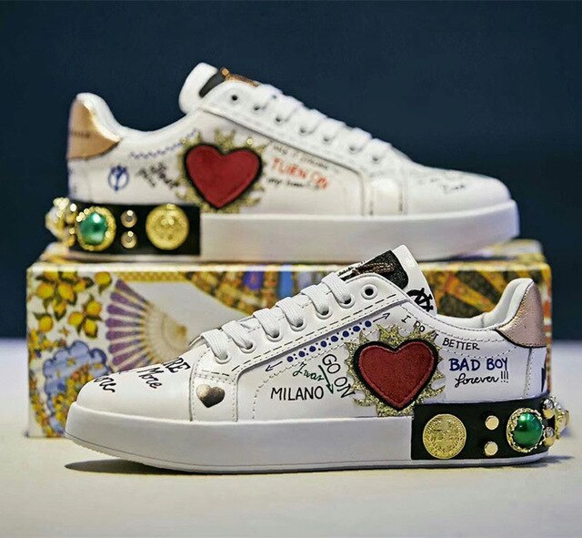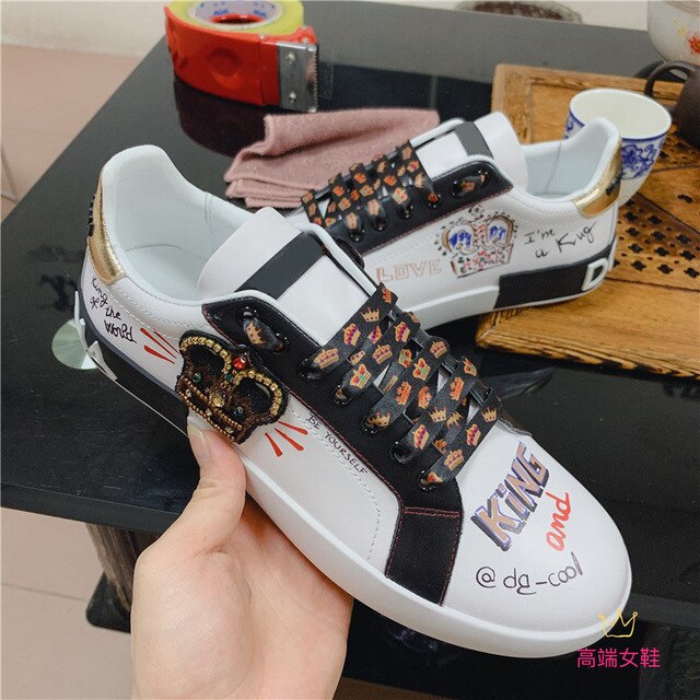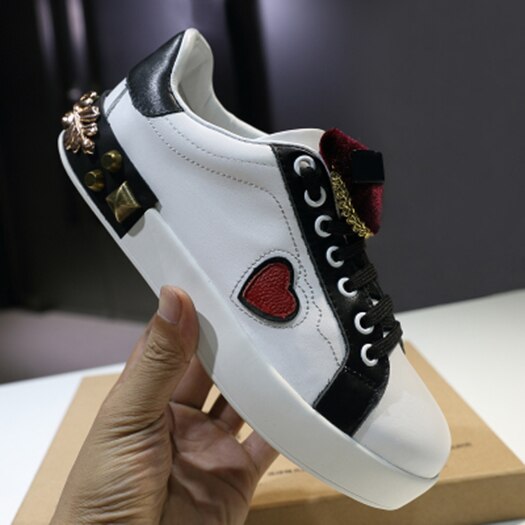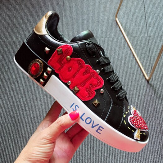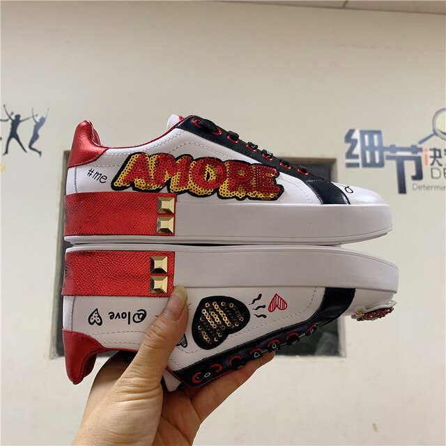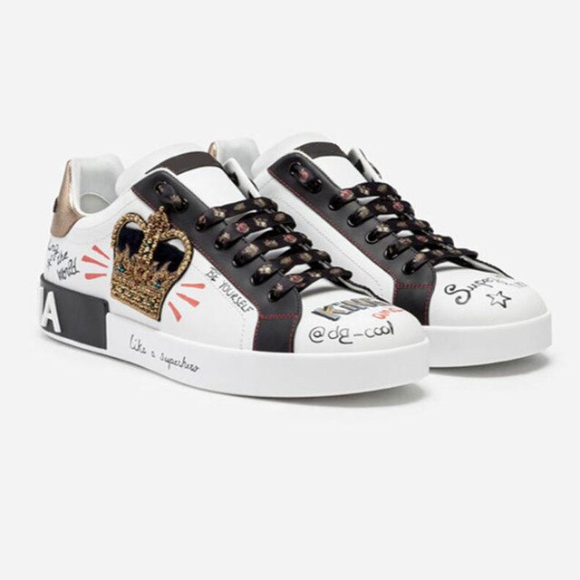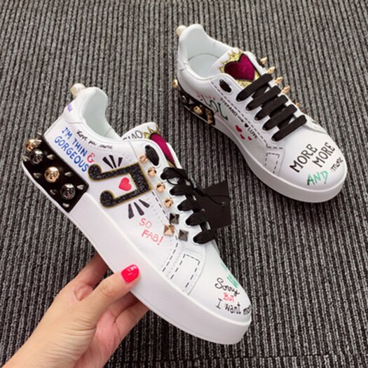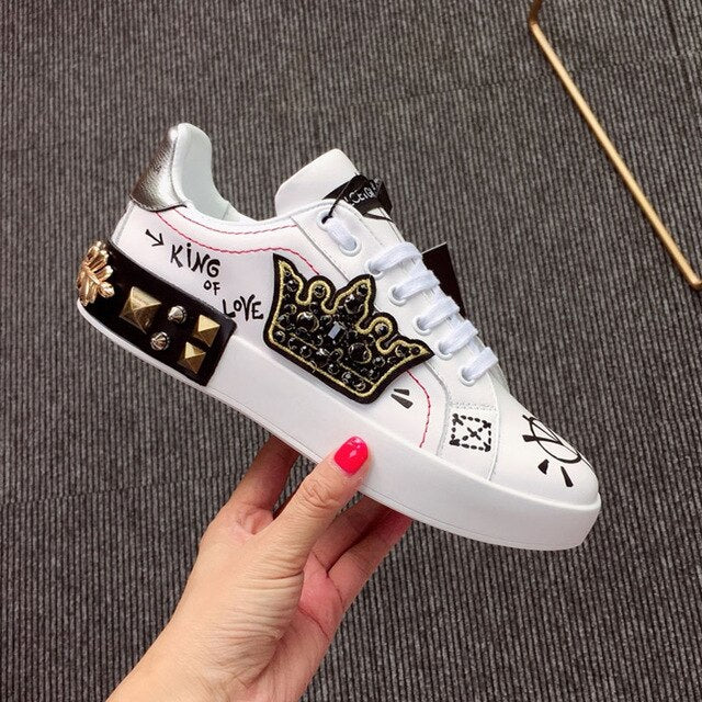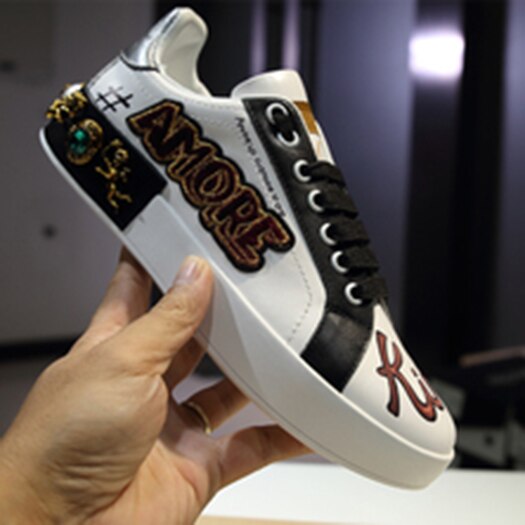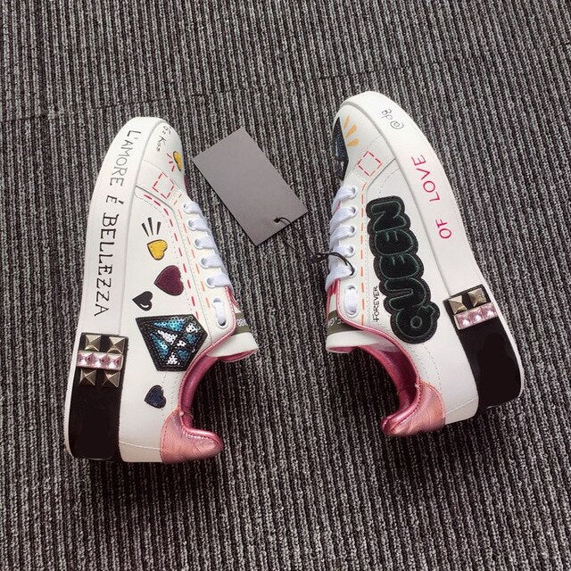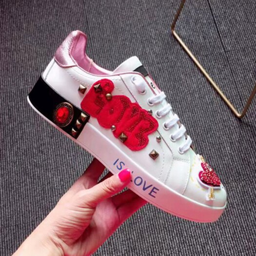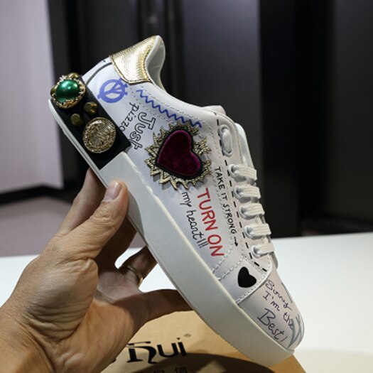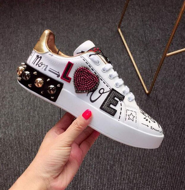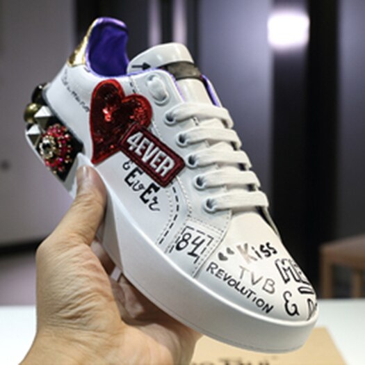 デザイナーシューズ 中国製 トレーナー フラットシューズ スタッド 刺繍入り スニーカー リベット 本革 レディース ホワイト メタル イタリア製 刺繍 クリスタル
