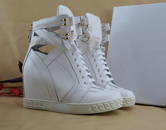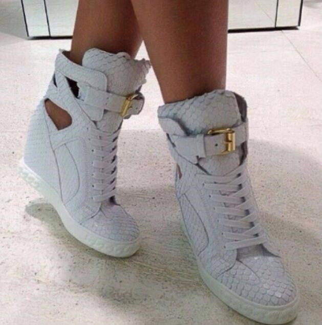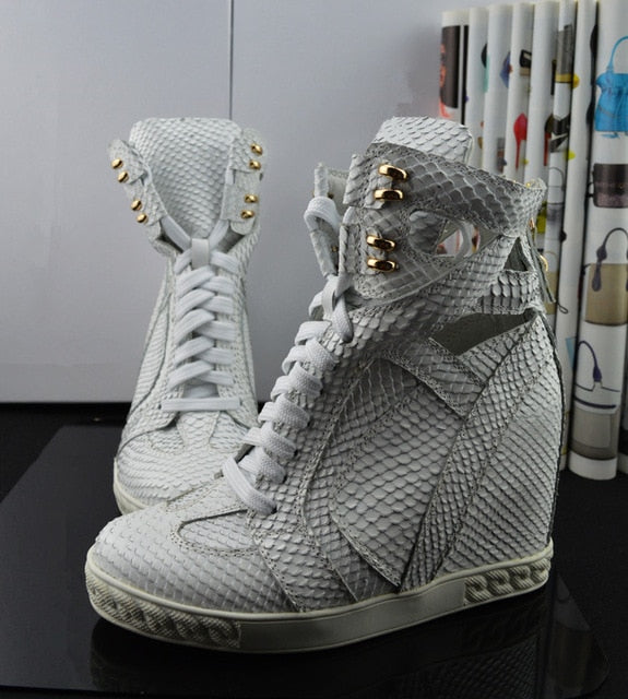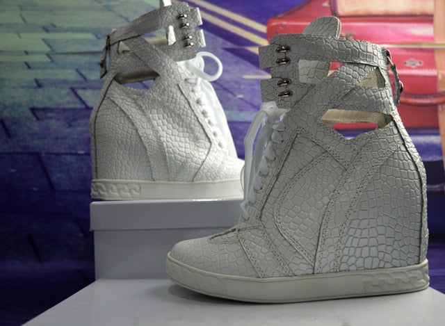 ファッション ホワイト パイソンレザー レディース レースアップ ハイトップ アンクルバックル レディース セクシー ウェッジスニーカー カットアウトスタイル カジュアルシューズ サイズ 41