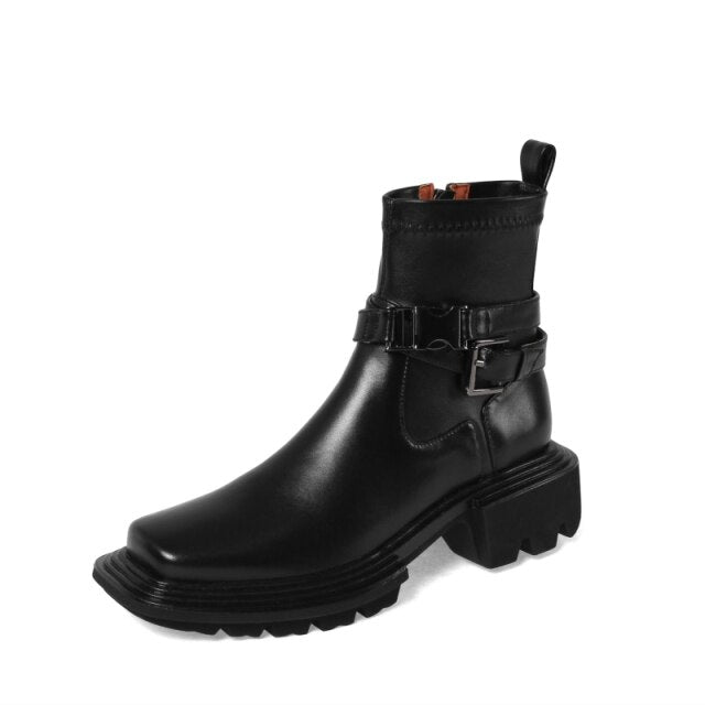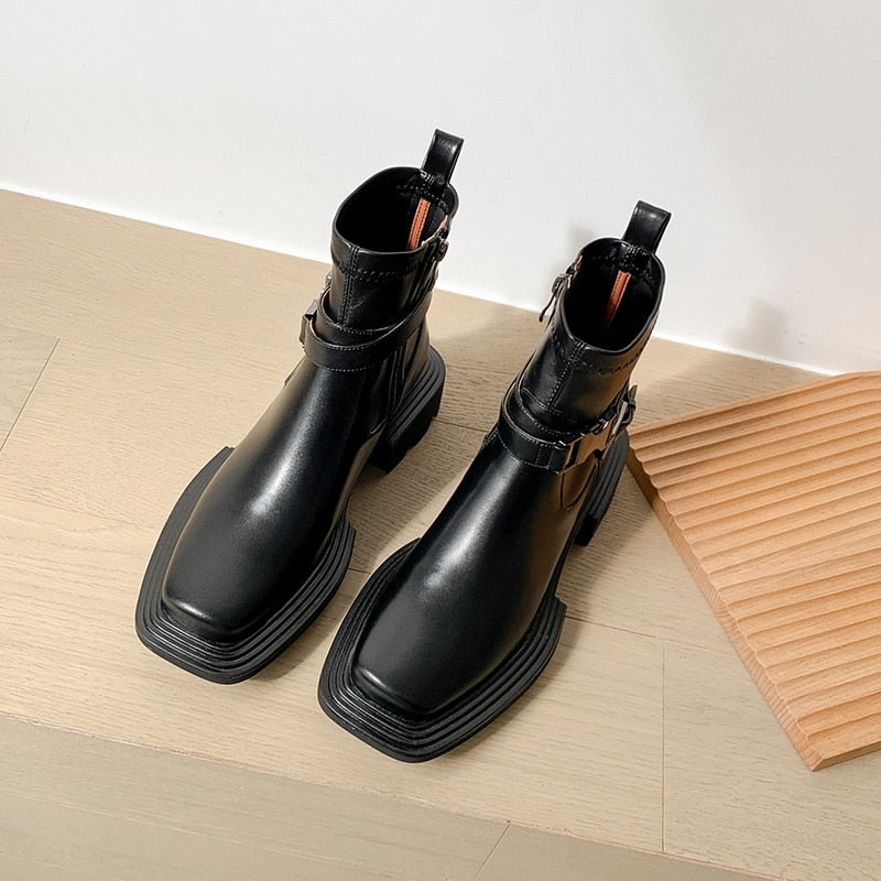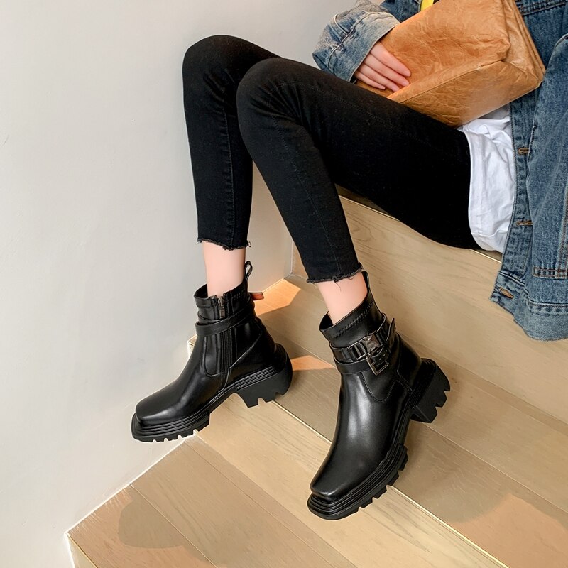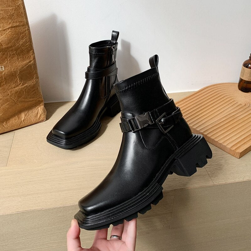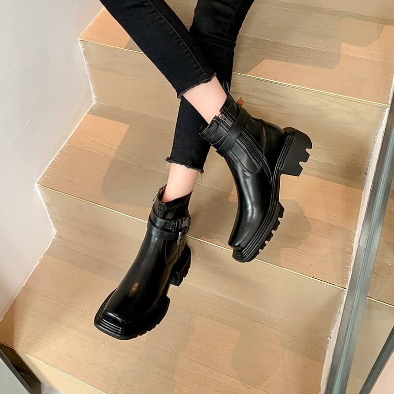 女性用スクエアトゥ本革プラットフォームブーツレトロトレンド