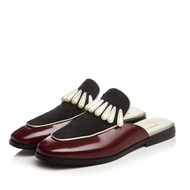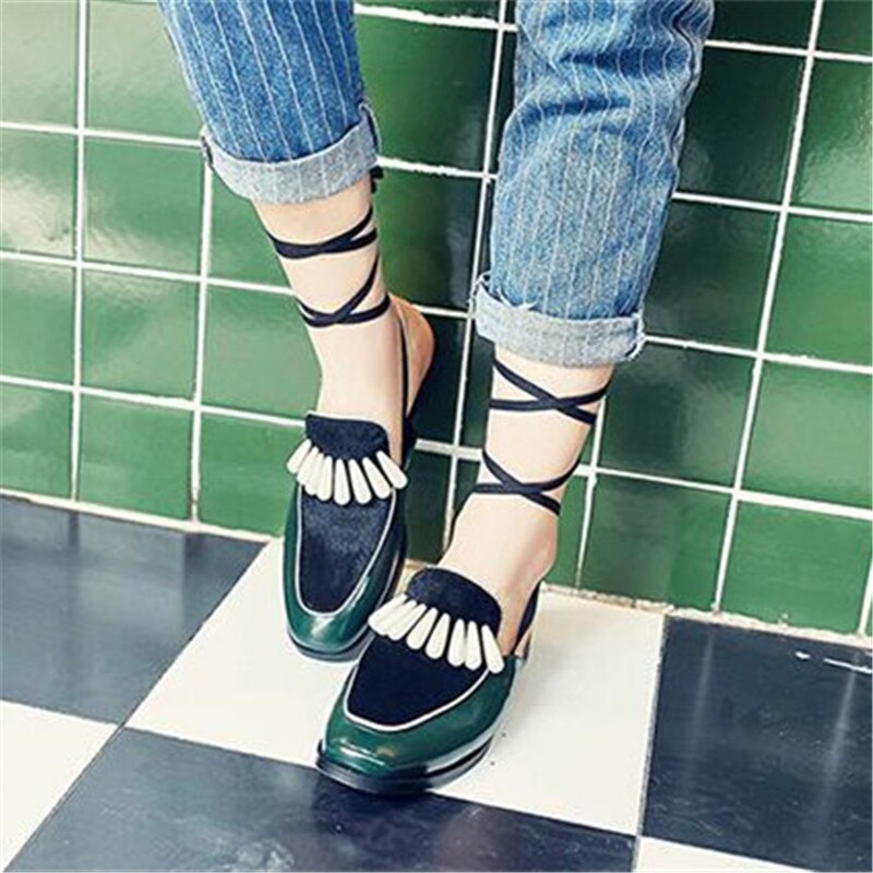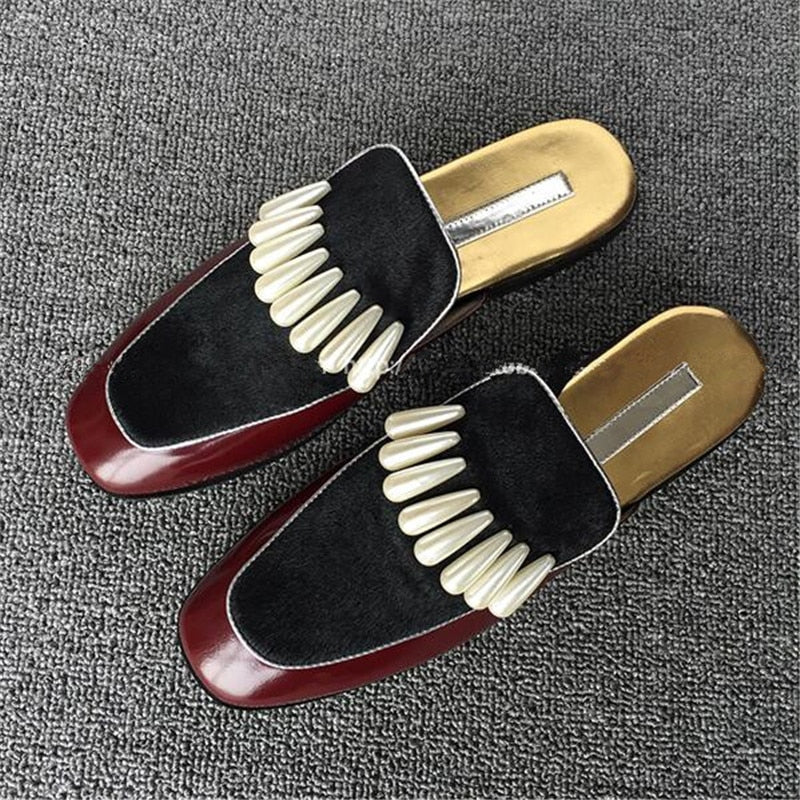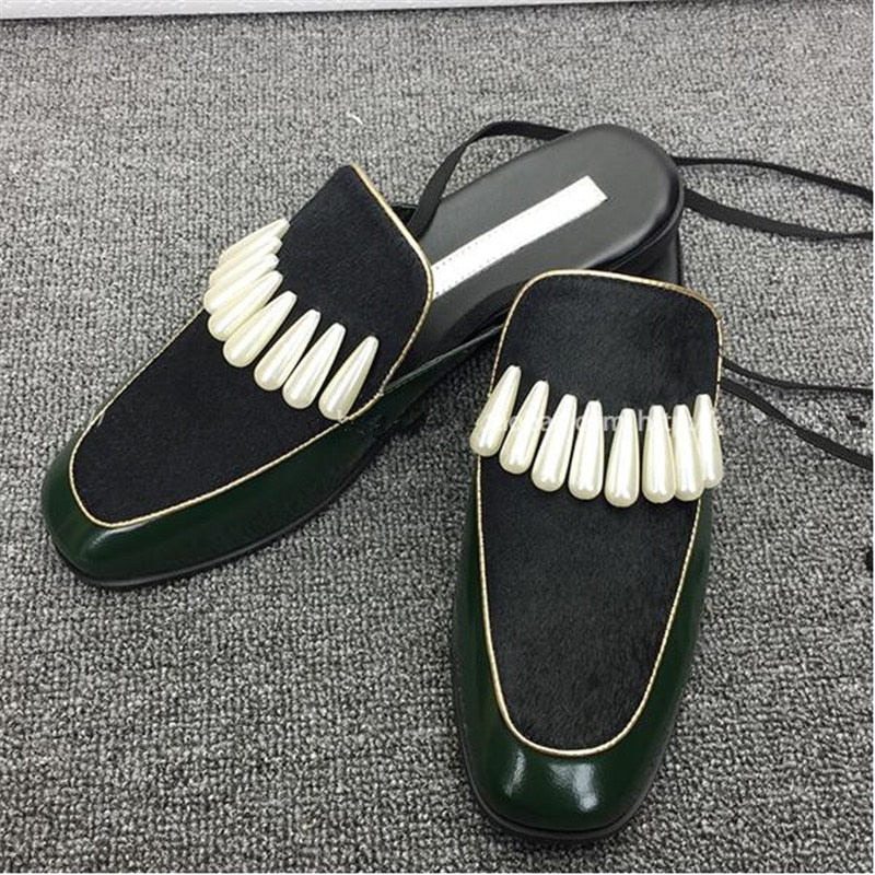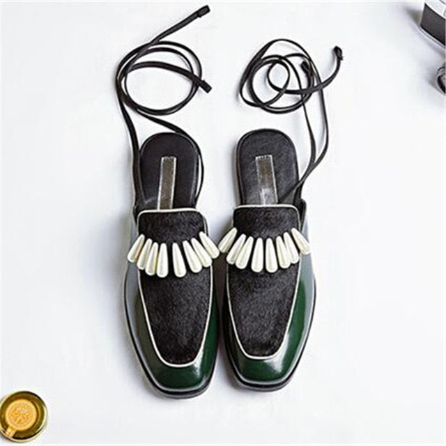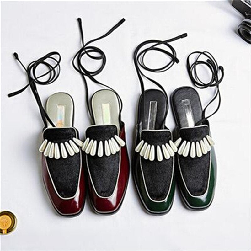 レザー ホースヘア パッチワーク アンクル ストラップ セクシー レディース サンダル パール フラット レースアップ ミュール スリッポン レディース スリッパ シューズ