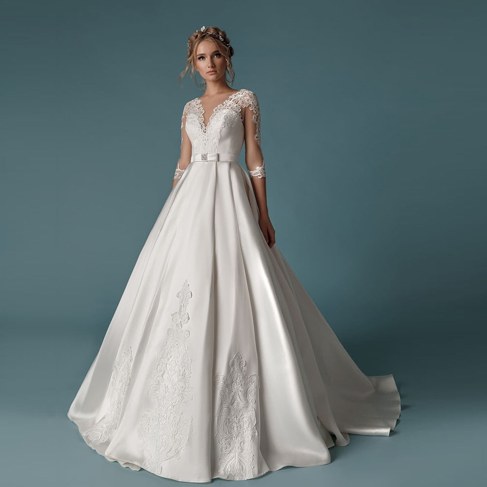 半袖ベストフランスサテンウェディングドレスVestido Blancoパールボウウエストアップリケシンプルブライダルガウンプラスサイズボダ
