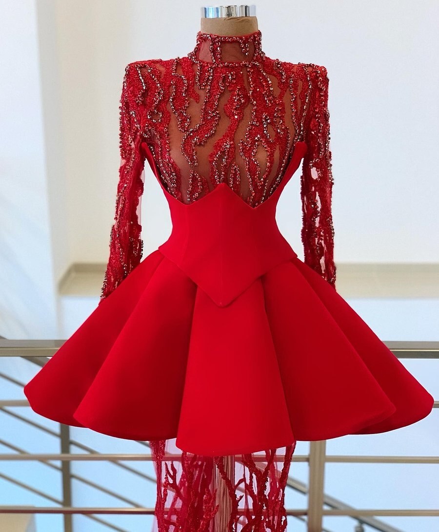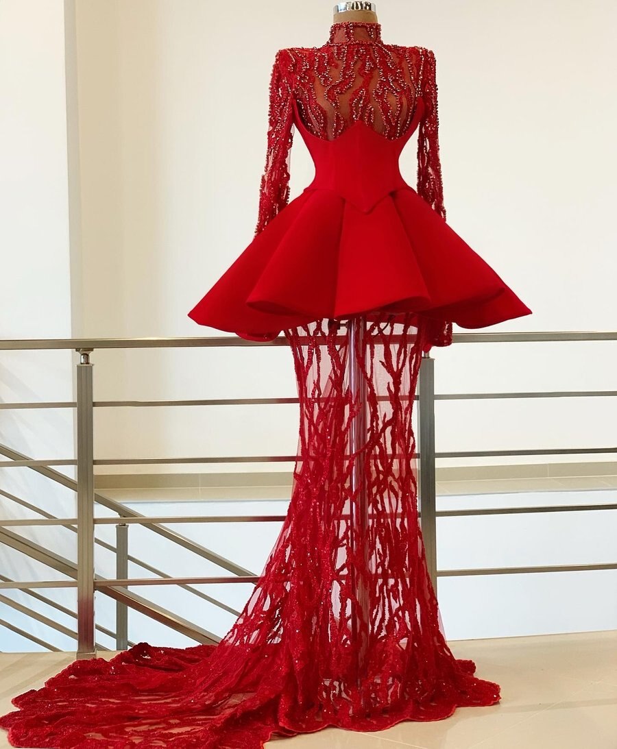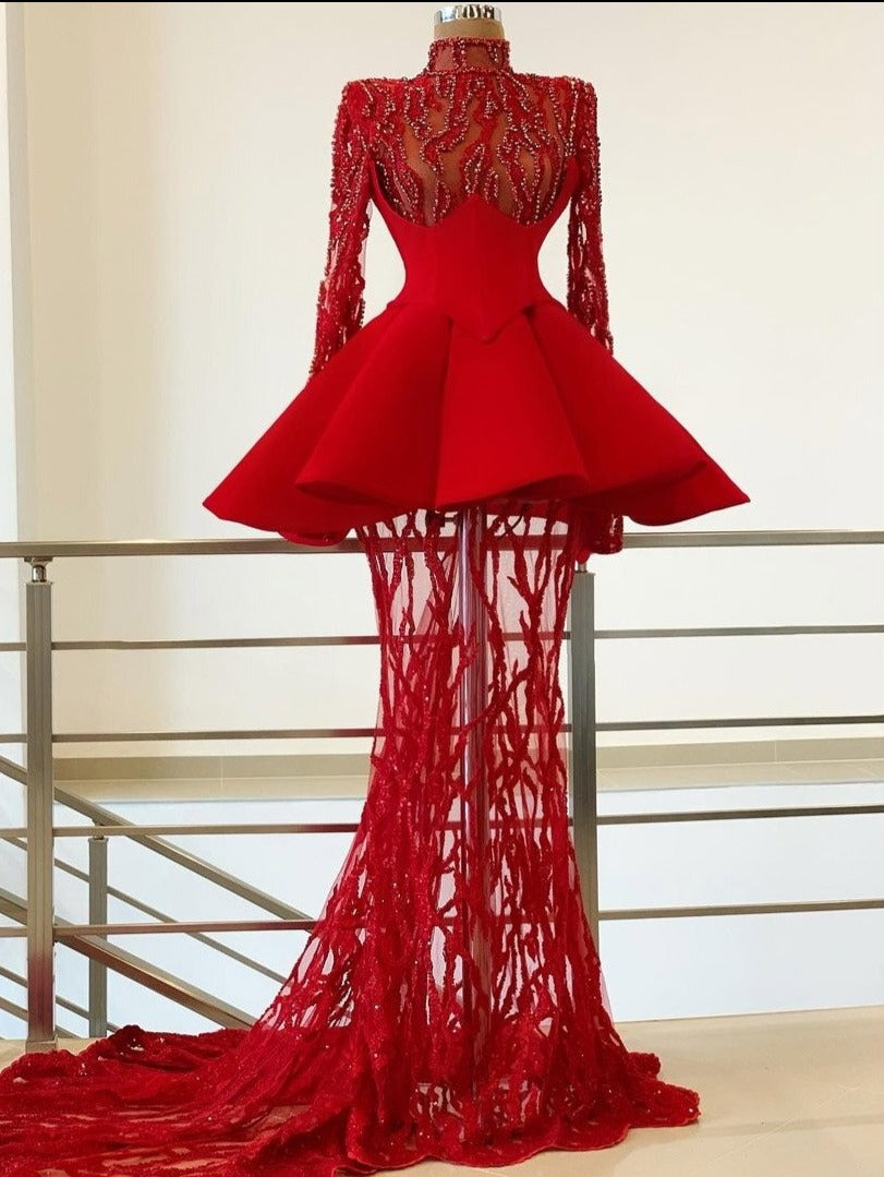 ハイカラーフルスリーブセクシーロングプロムガウン