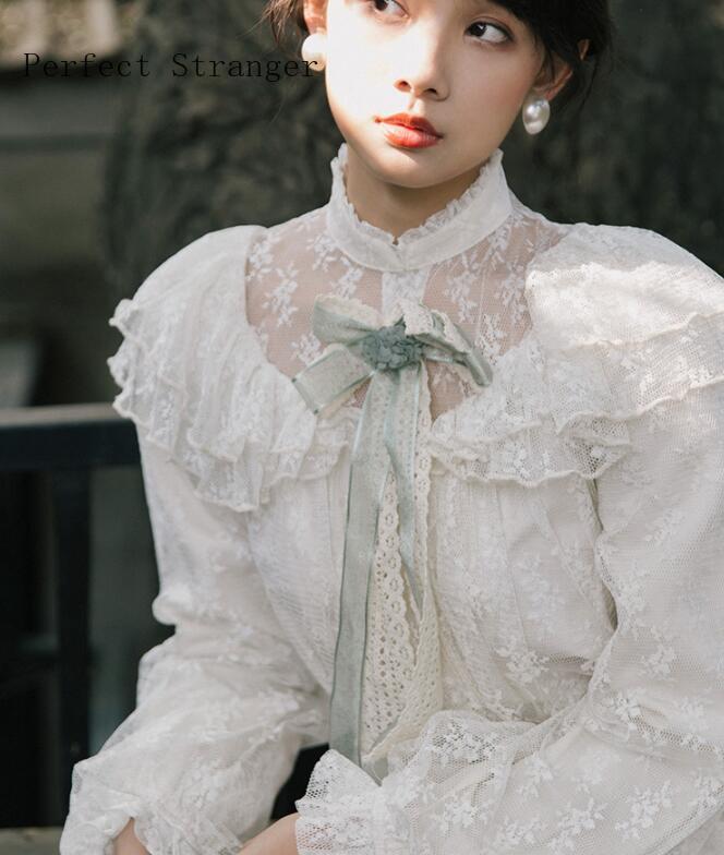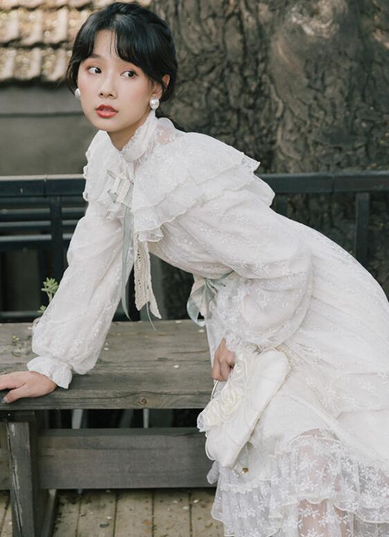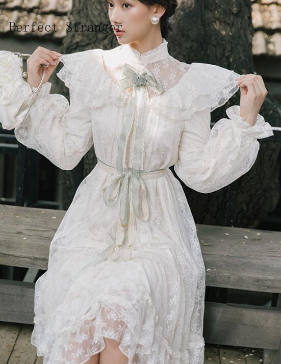 ブローチ付き長袖ガーゼレースロングドレス