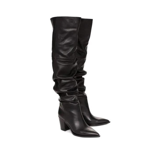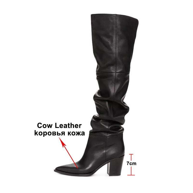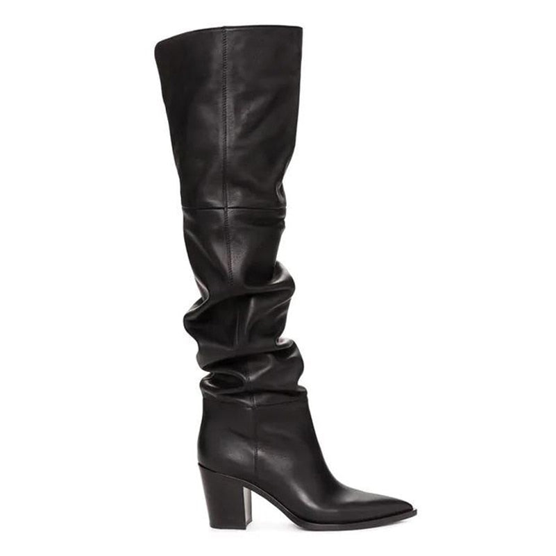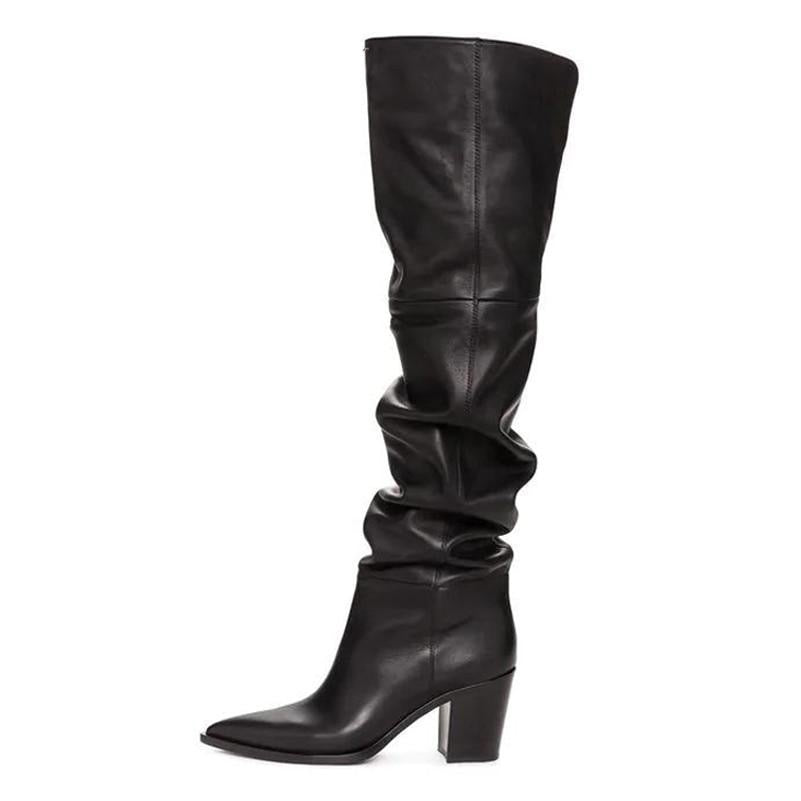冬用オーバーニーブーツ レディース 天然本革 厚手ハイヒール サイハイブーツ プリーツロングシューズ レディース 秋