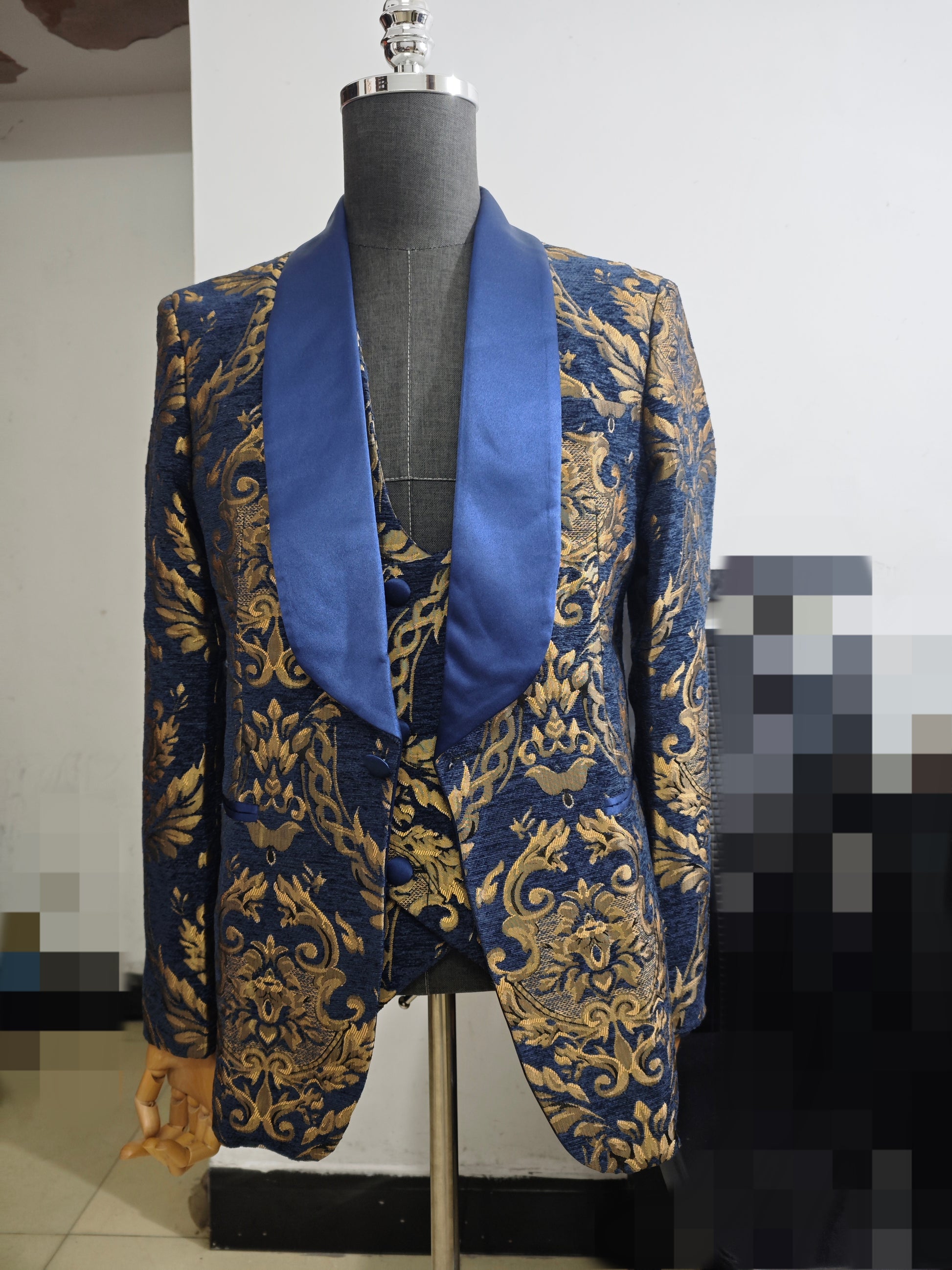結婚式用ネイビーブルーフローラルジャカードプロムメンズスーツ