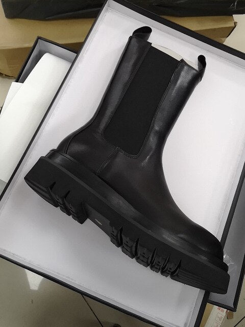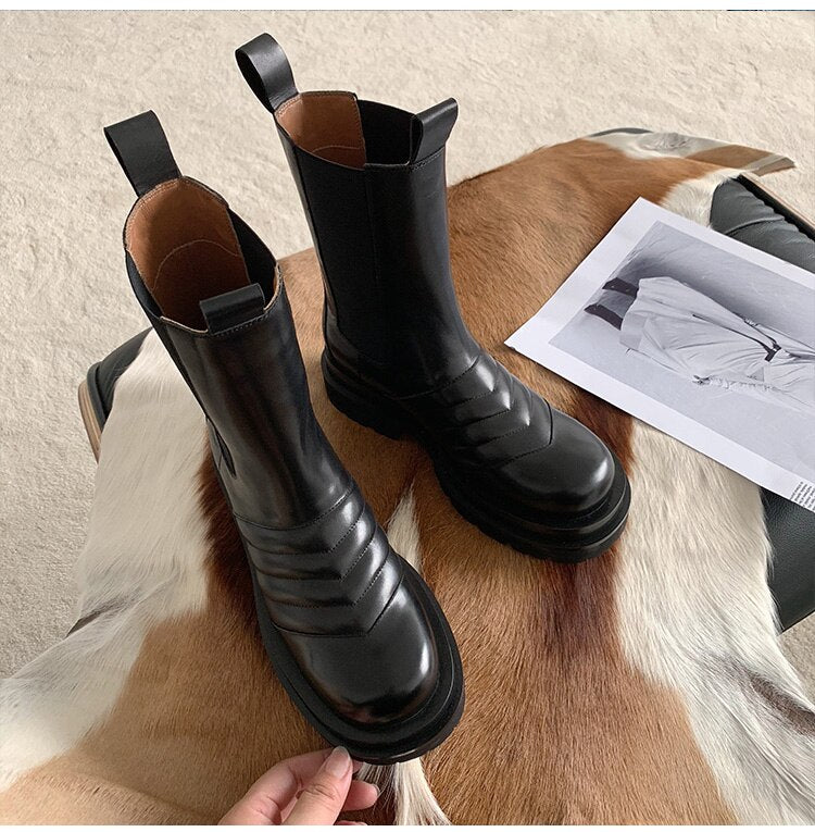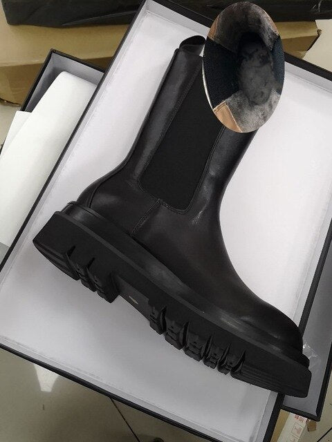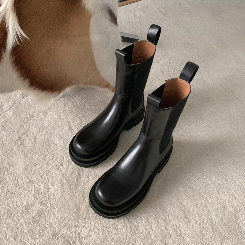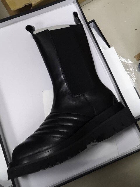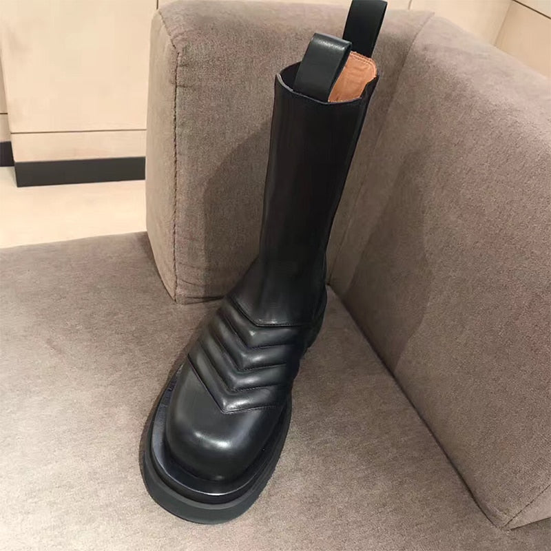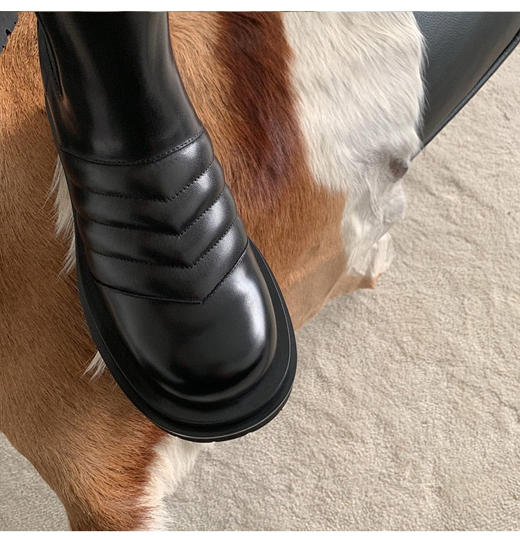 新着 エラスティックバンド レザーブーツ ラウンドトゥ フラット チャンキーソール ナイトブーツ 冬 ブランドシューズ レディース チェルシーブーツ
