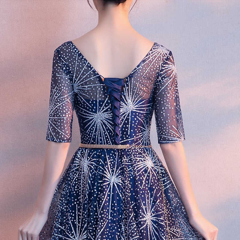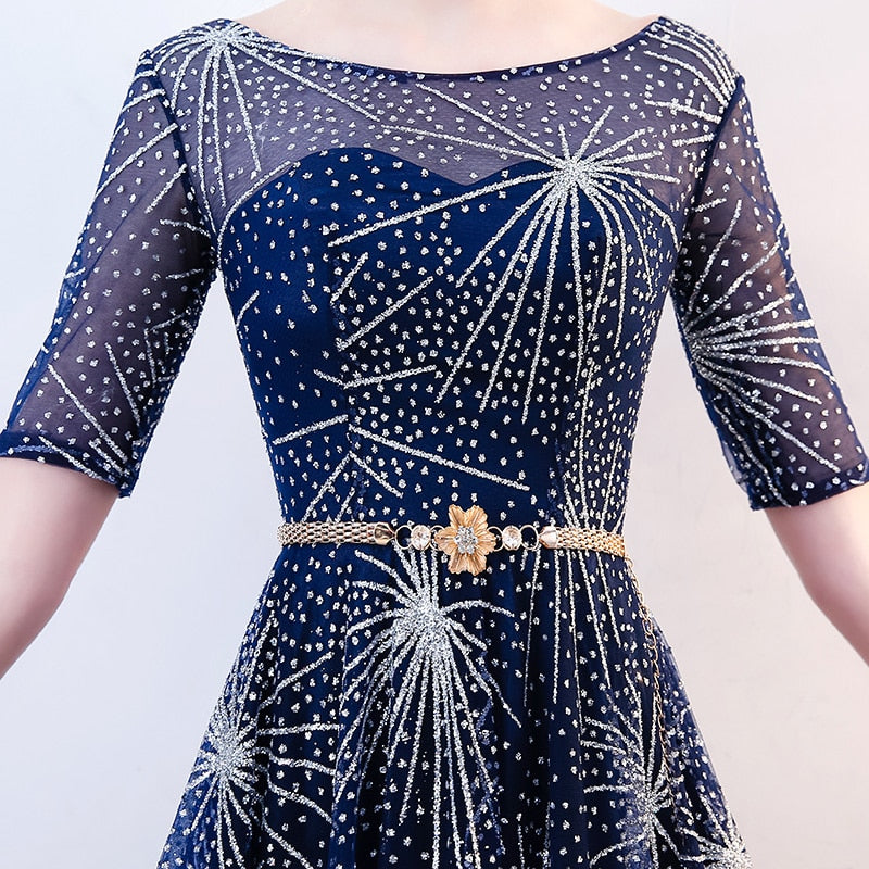 新着高級ホームカミングドレス、ファッショナブルなソフトシャンパンイブニングドレス、エレガントなベルトパーティーガウン、卒業式
