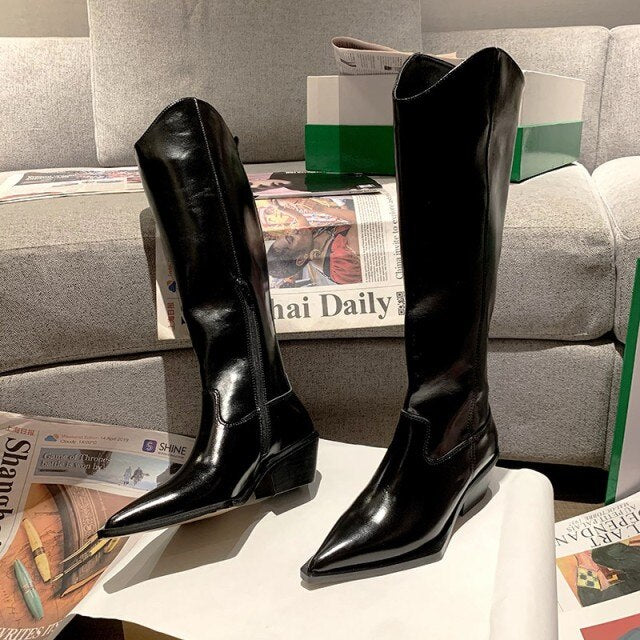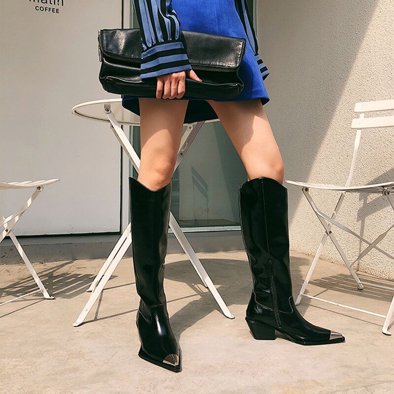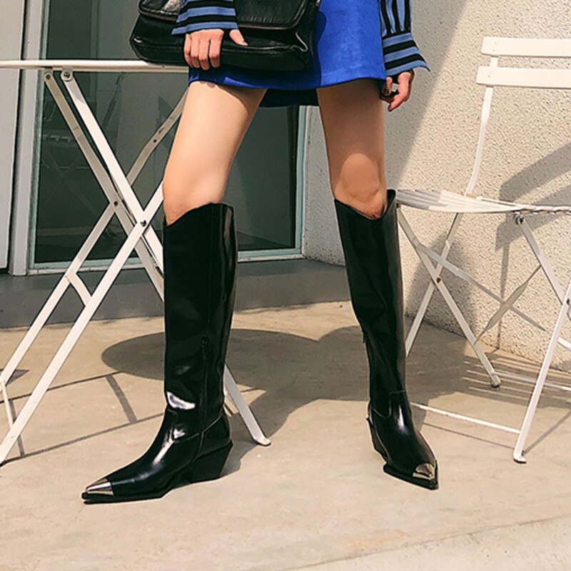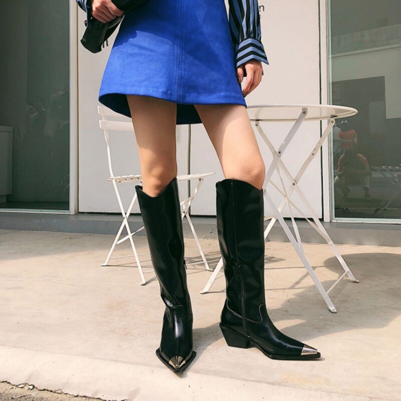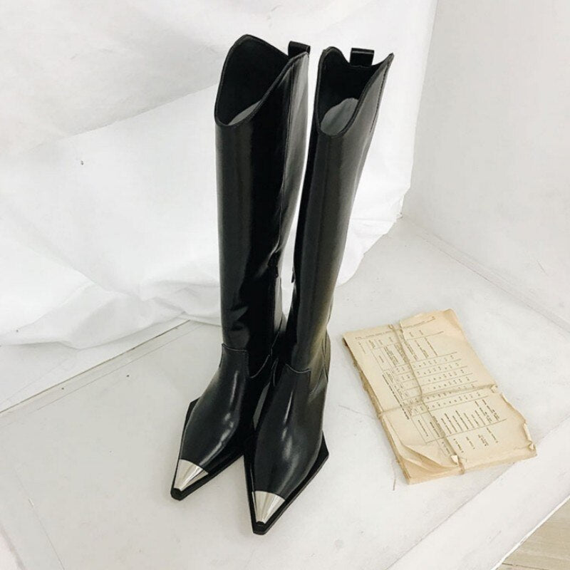 新作秋冬レディースメタルポインテッドトゥニーハイブーツ