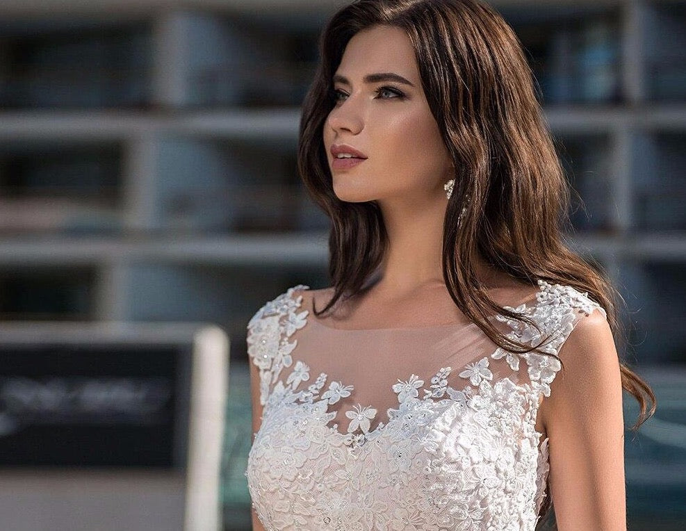 Oネックのボタンアップノースリーブプリンセスブライドドレス