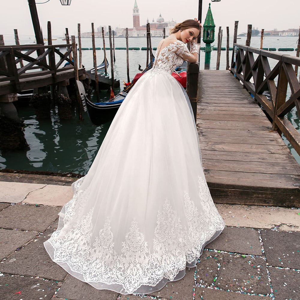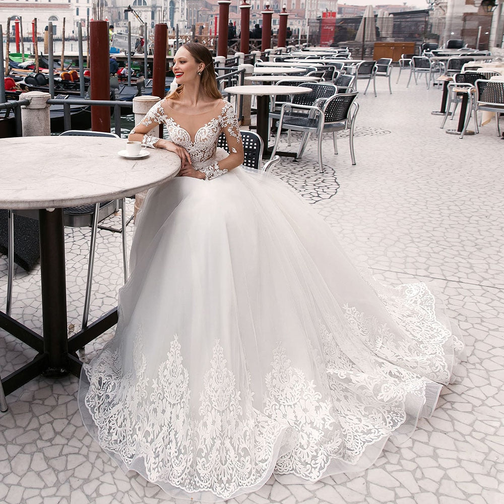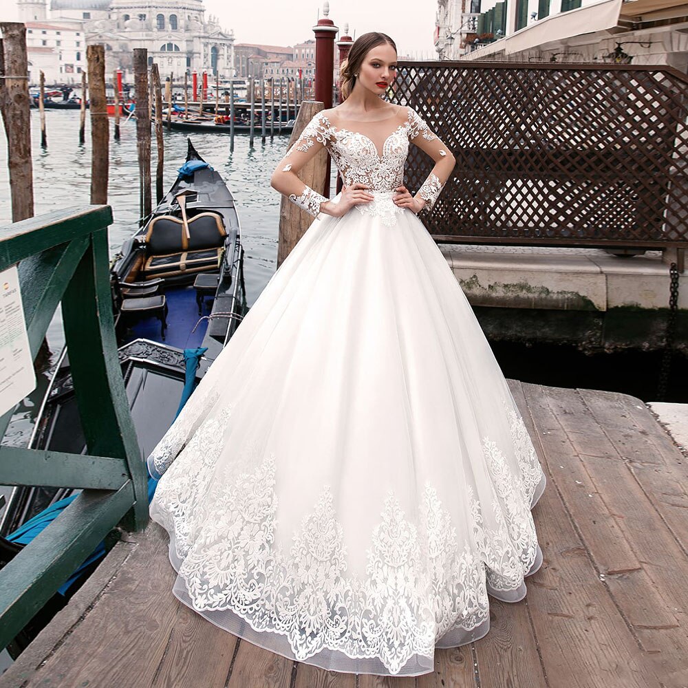パールアップリケレイヤーチュールAラインウェディングドレスロングスリーブプラスサイズベスティドブランコOネックボタンアッププリンセスブライドガウン