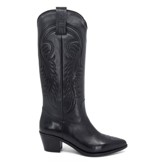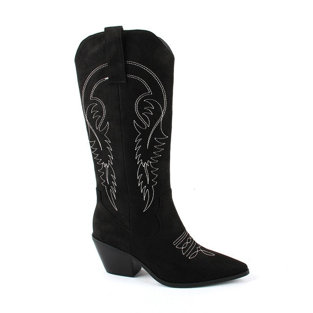 女性用ウエスタンカウボーイブーツ ポインテッドトゥ レディースシューズ ブランドエンボス加工スエードレザーシューズ ミッドカーフチャンキーウェッジブーツ