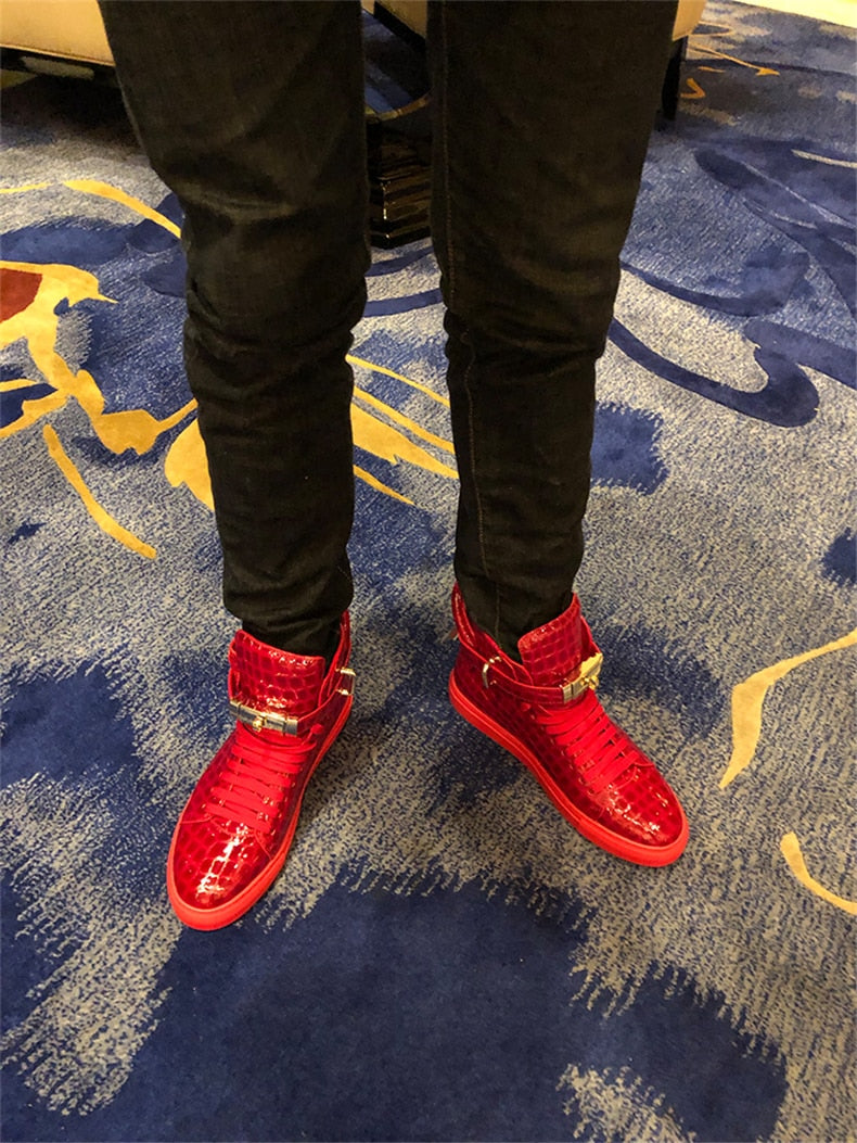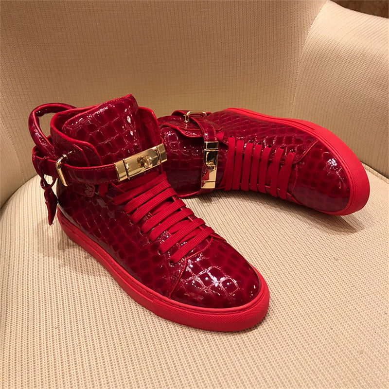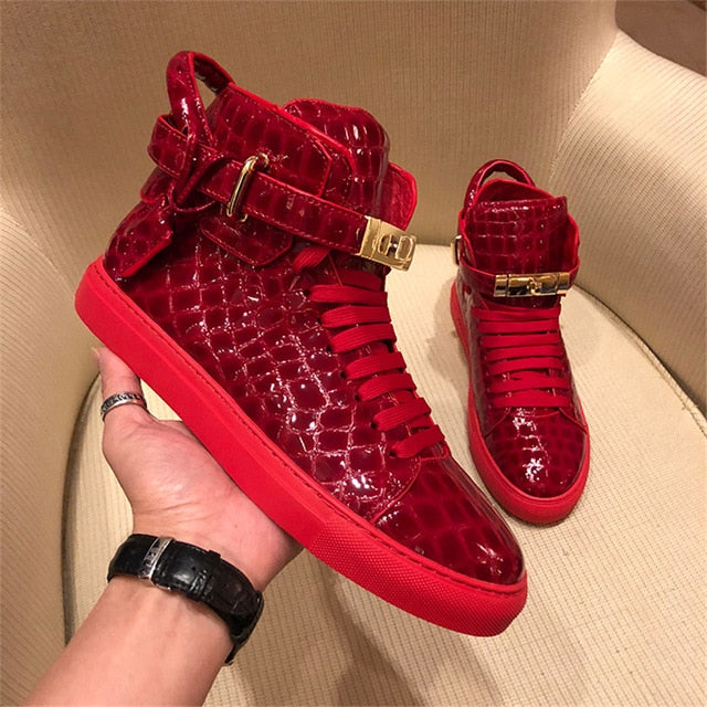 メンズ エンボス加工 クロコダイル ハイトップ スニーカー ロック レース レッド スニーカー 本革 デザイナー フラット メンズ スニーカー カジュアル シューズ