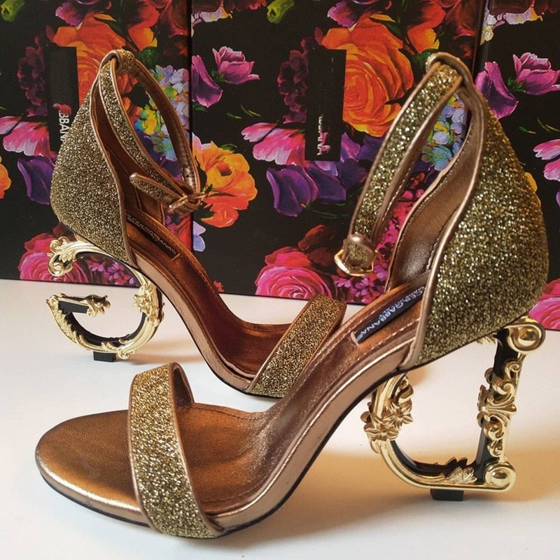 セクシーなレディースクラブウェアオープン本革ハイイレギュラーストレンジゴールドヒールレターサンダルシューズパンプススパンコールキラキラ7色ラグジュアリー