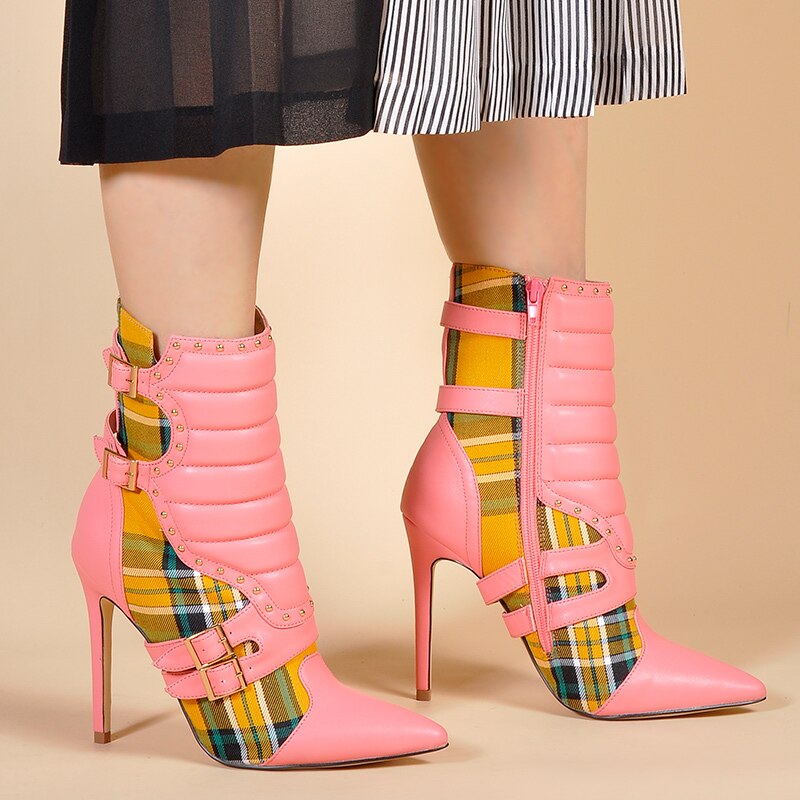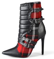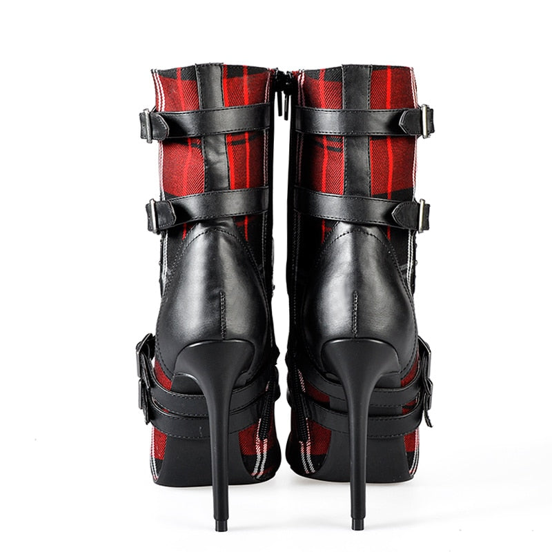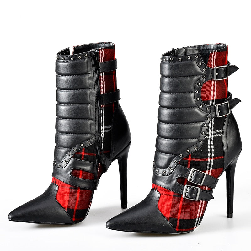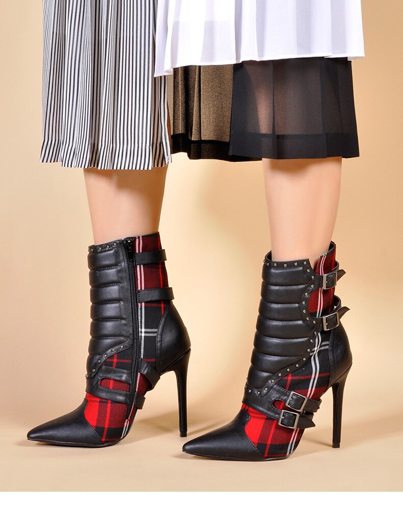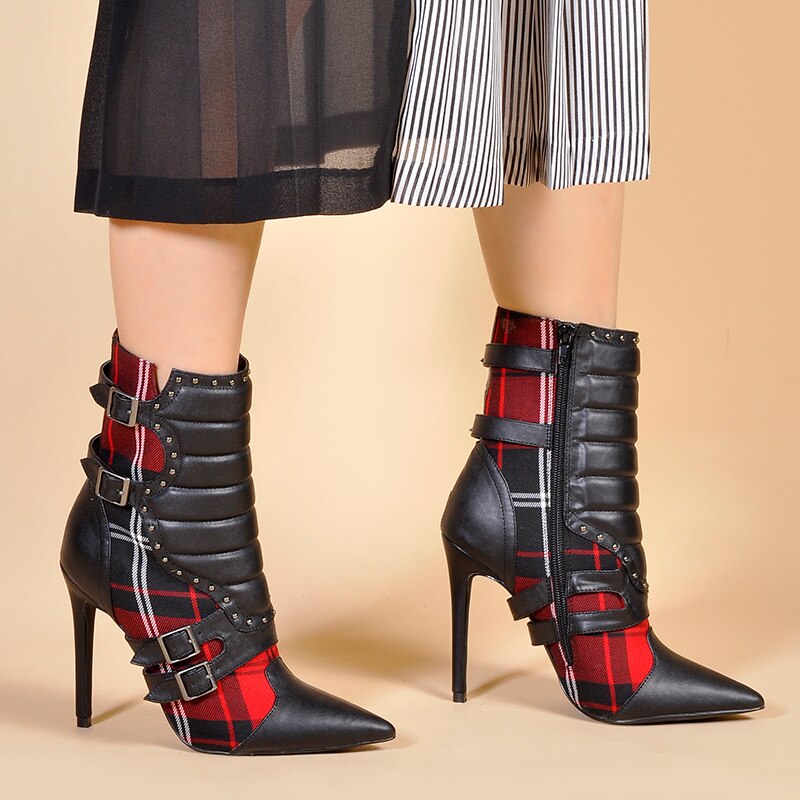 女性用ハイヒール アンクルブーツ、ポインテッドトゥブーツ、レディースレッドチェック柄ブーツ、モーターサイクルブーツ