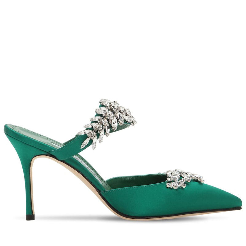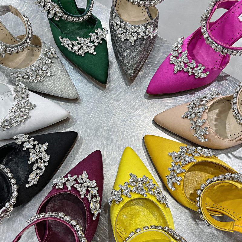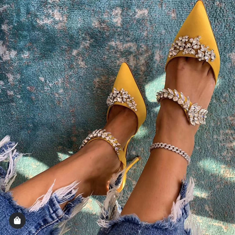 2022年新作ファッションハイヒールスティレットポインテッドトゥラインストーンシングルシューズサテンウェディングシューズスリッパ