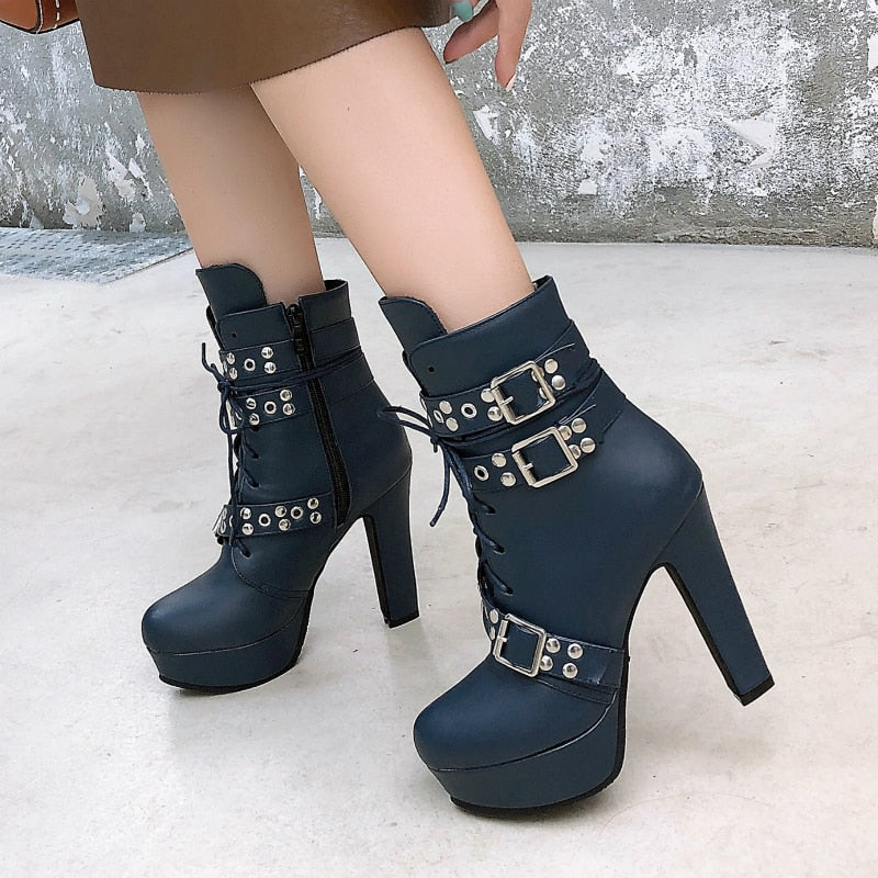 レディース アンクルブーツ プラットフォーム レースアップ ハイヒール