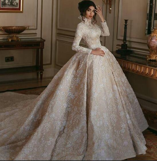 Luxury High Neck Champagne Middle East Wedding Dress White Lace Appliqued Long Sleeves Arabic Bridal Gowns Court Train