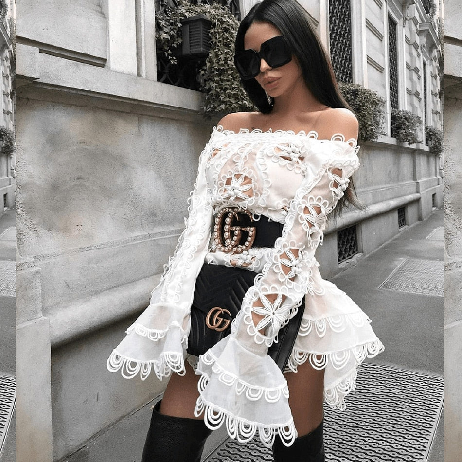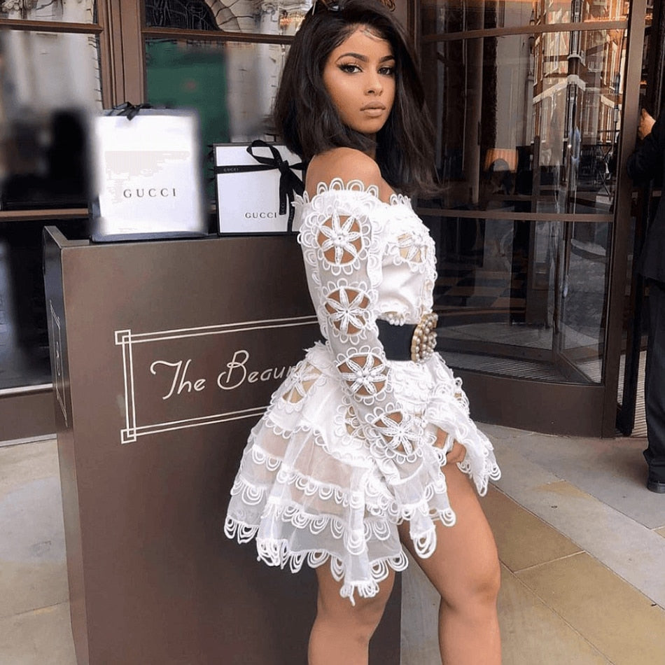 new elegant white lace openwork chiffon dress sexy women's long sleeve mini fishtail dress celebrity party dress Vestidos