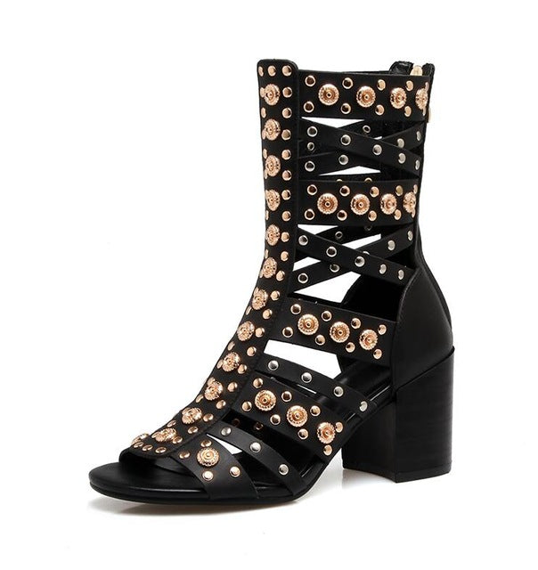 Summer Rivet Boots Open Toe Hollow Real Leather Rivet Sandals Square Heel Rome High Heel Sandals Women Gladiator Shoes