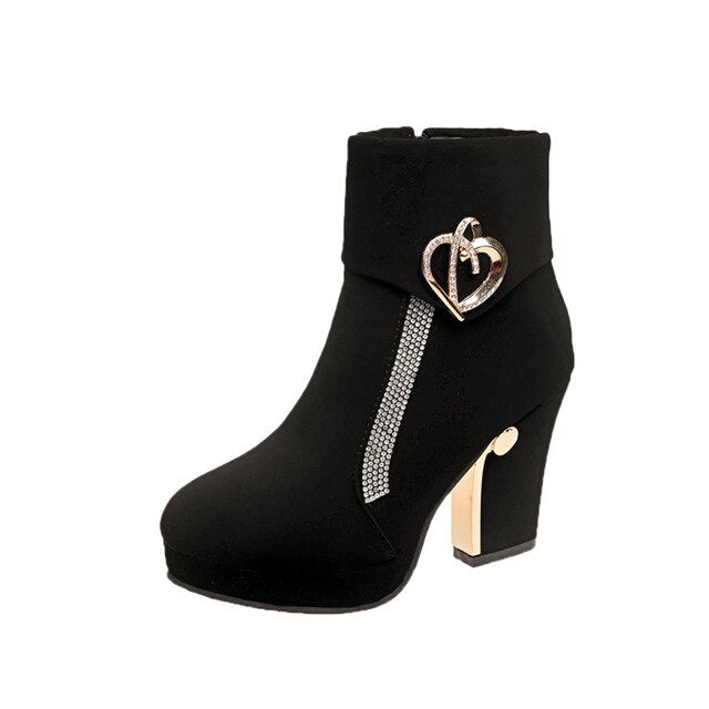 Thick heel color matching side zipper short boots heel rhinestone frosted water