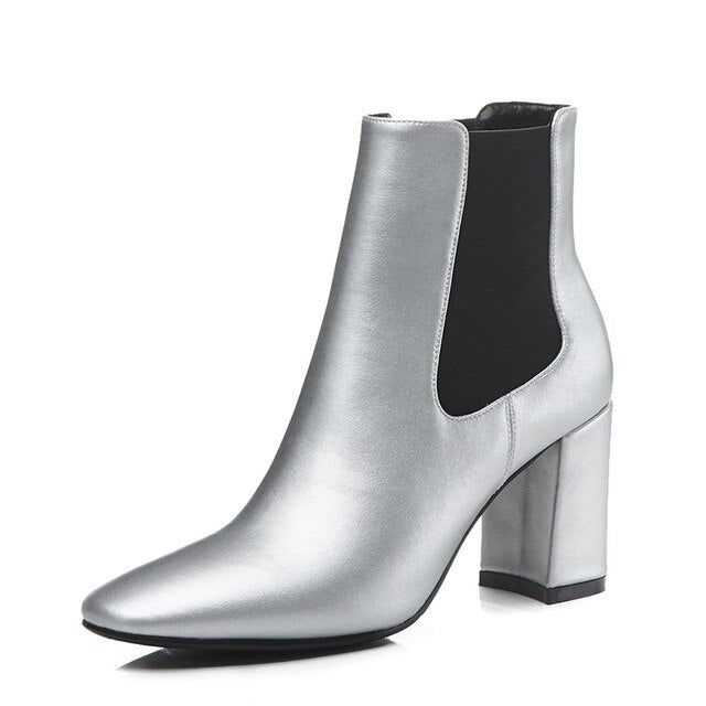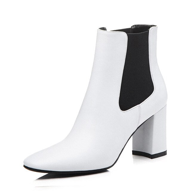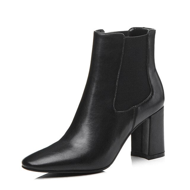 Fashion Genuine Leather Chelsea Boots Women Elastic Ankle Women Boots High Square Heel Ladies Booties Pointed Toe B151