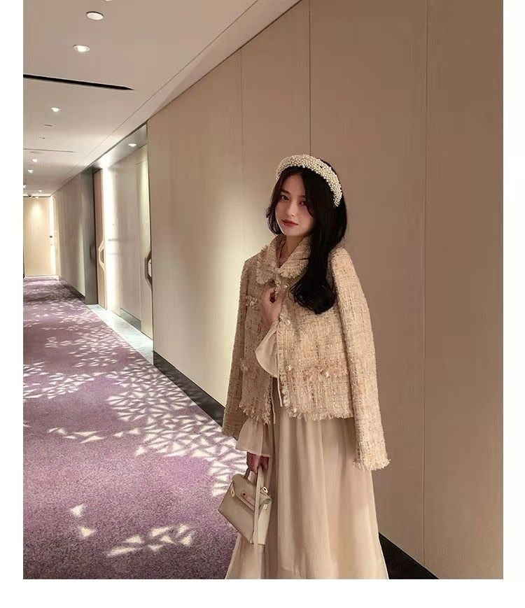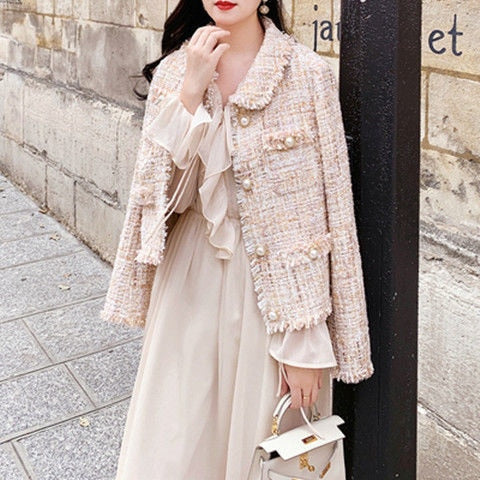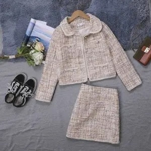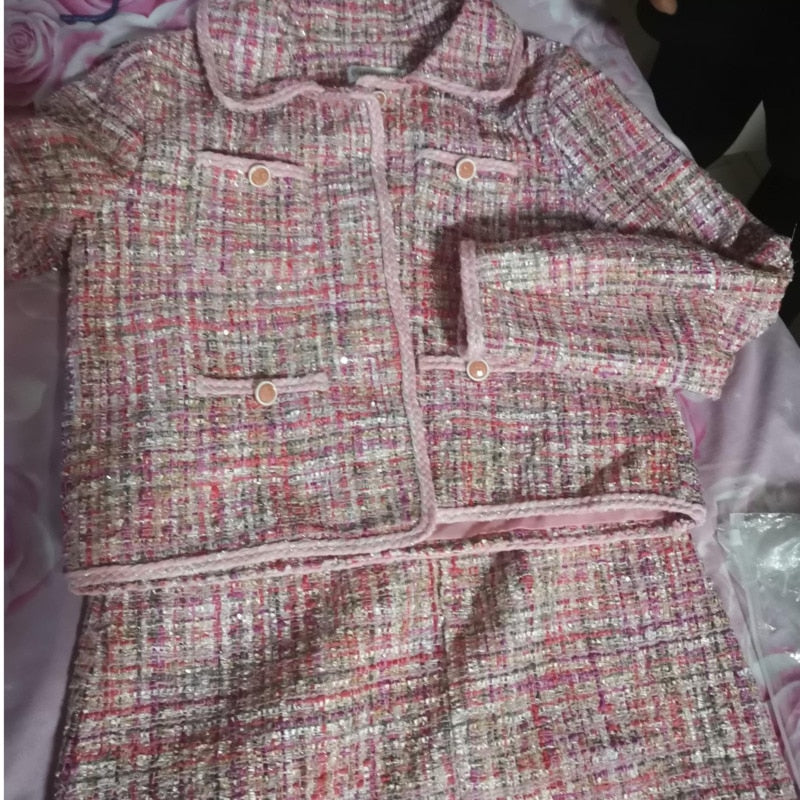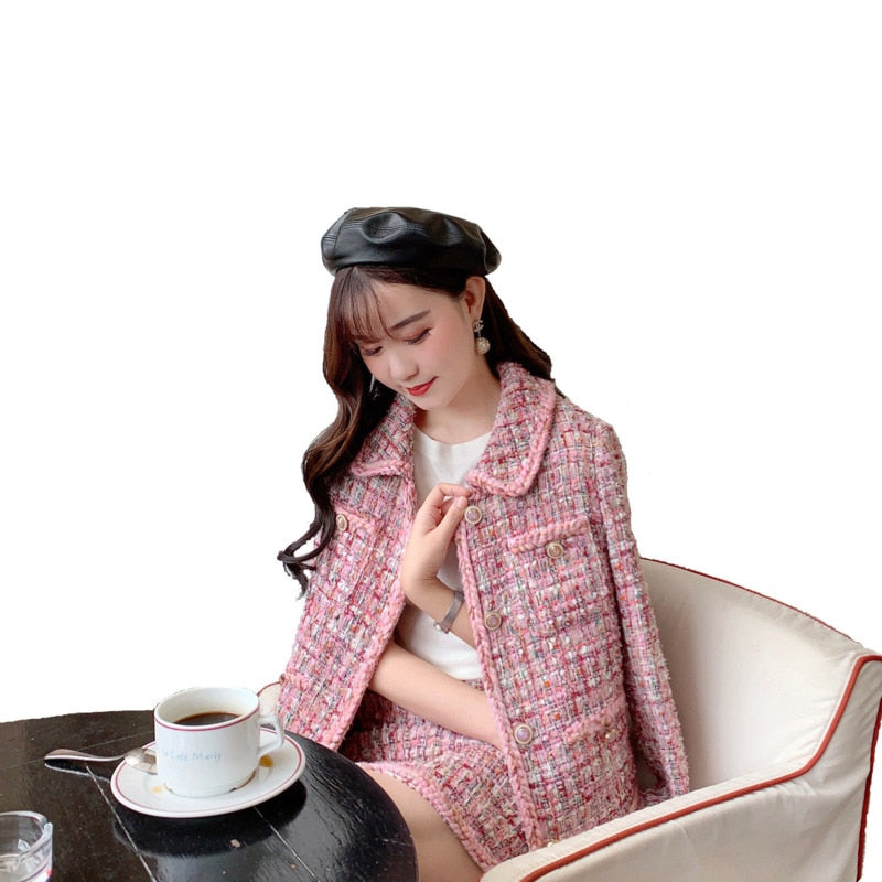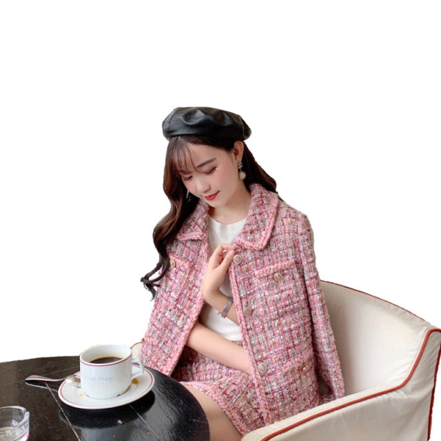 Pink Tweed Female Coat For Women Suits Skirt Elegant