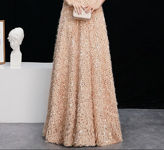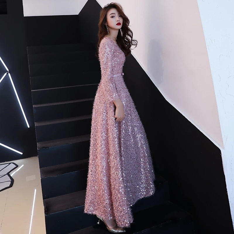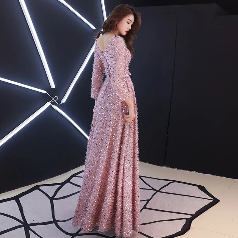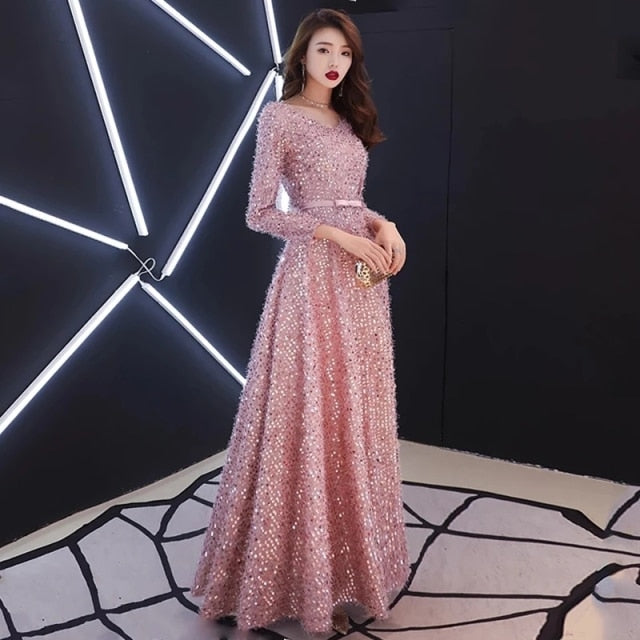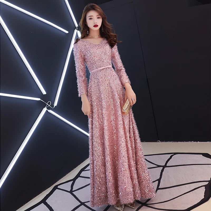 Elegant Pink Feathers Long Evening Dress with Long-sleeve Shiny