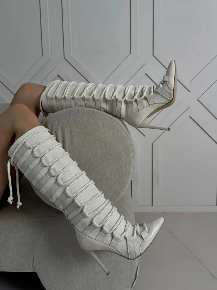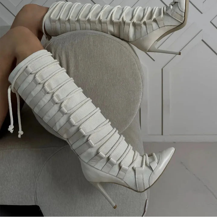2025 Women Pointed Toe Lace Up Thin High Heel Sexy Stiletto Zip White Heel Knee High Boots