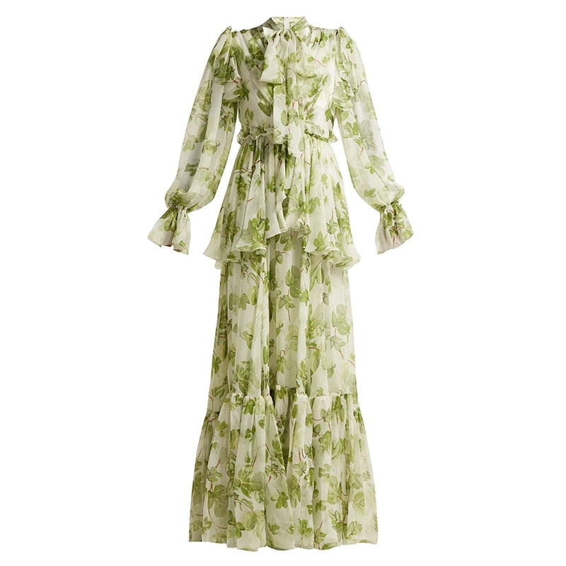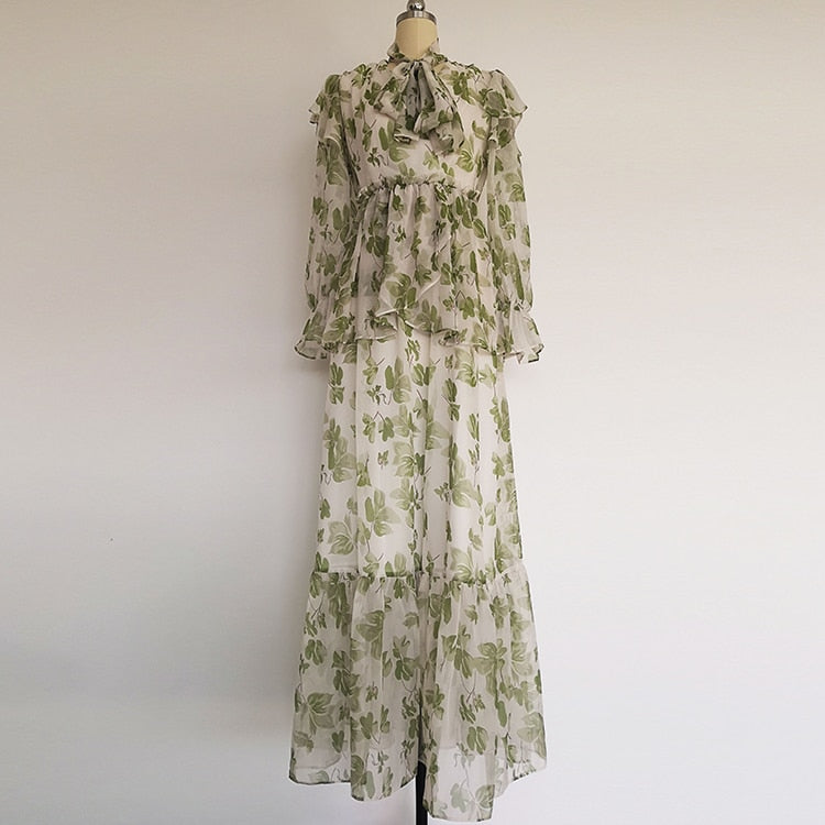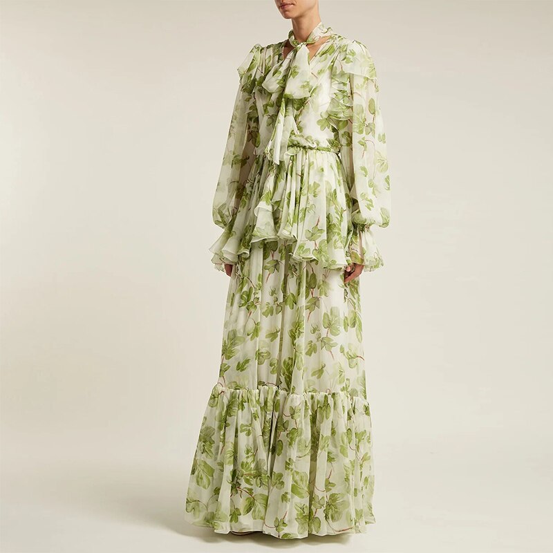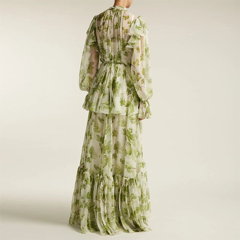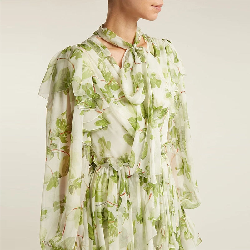 Ruffles Green Flower Print Lantern Sleeve Party Elegant Dresses