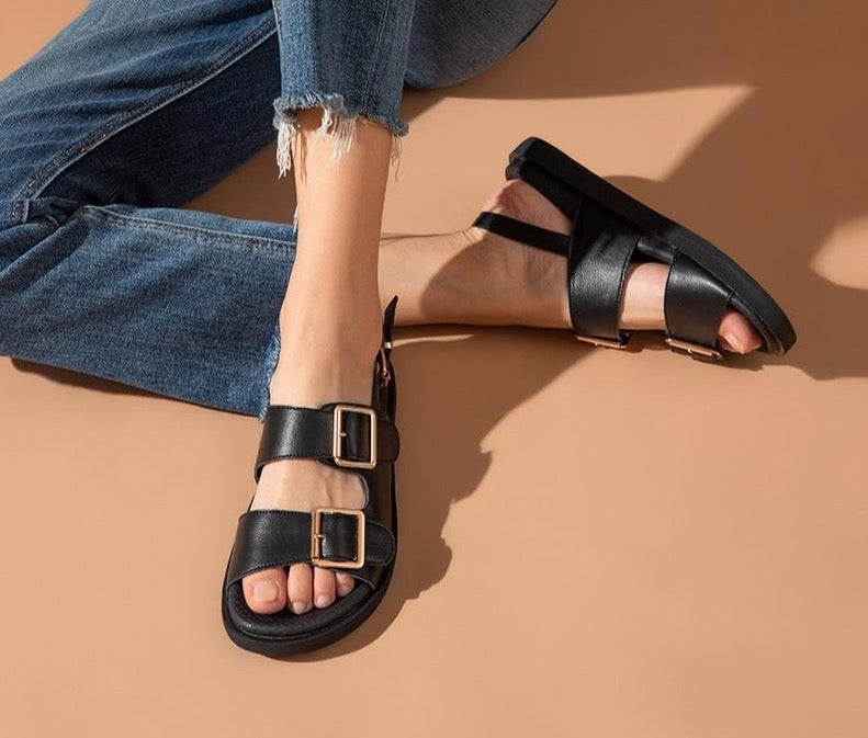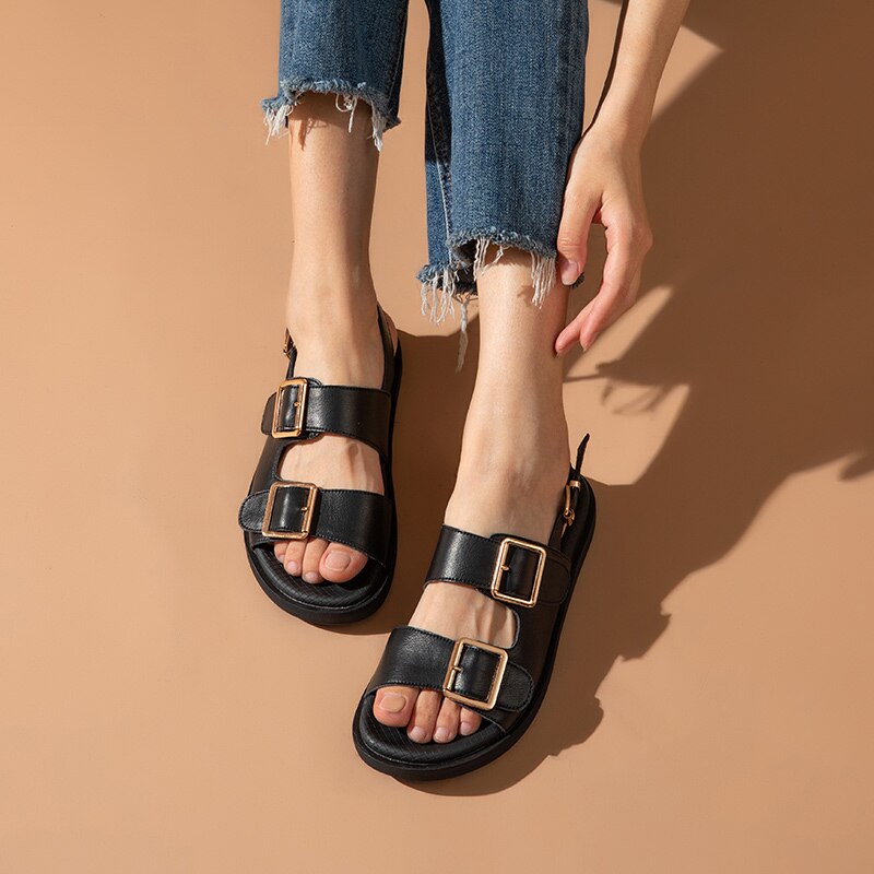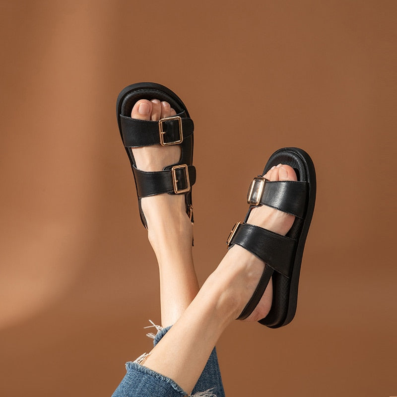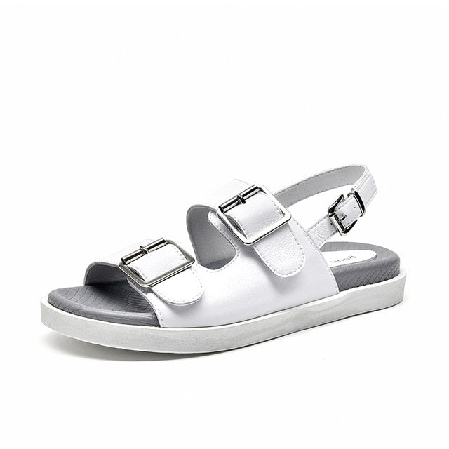 Women Genuine Cow Leather Metal Detailed Ankle Buckle Strap Summer Beach Ladies Low Heel Shoes Handmade