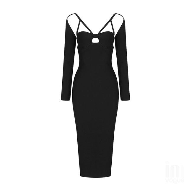 High Quality Black Long Sleeve V-neck Bodycon Rayon Bandage Dress Elegant Cocktail Party Dress Vestidos
