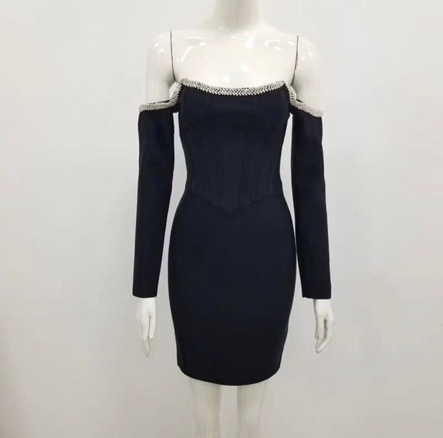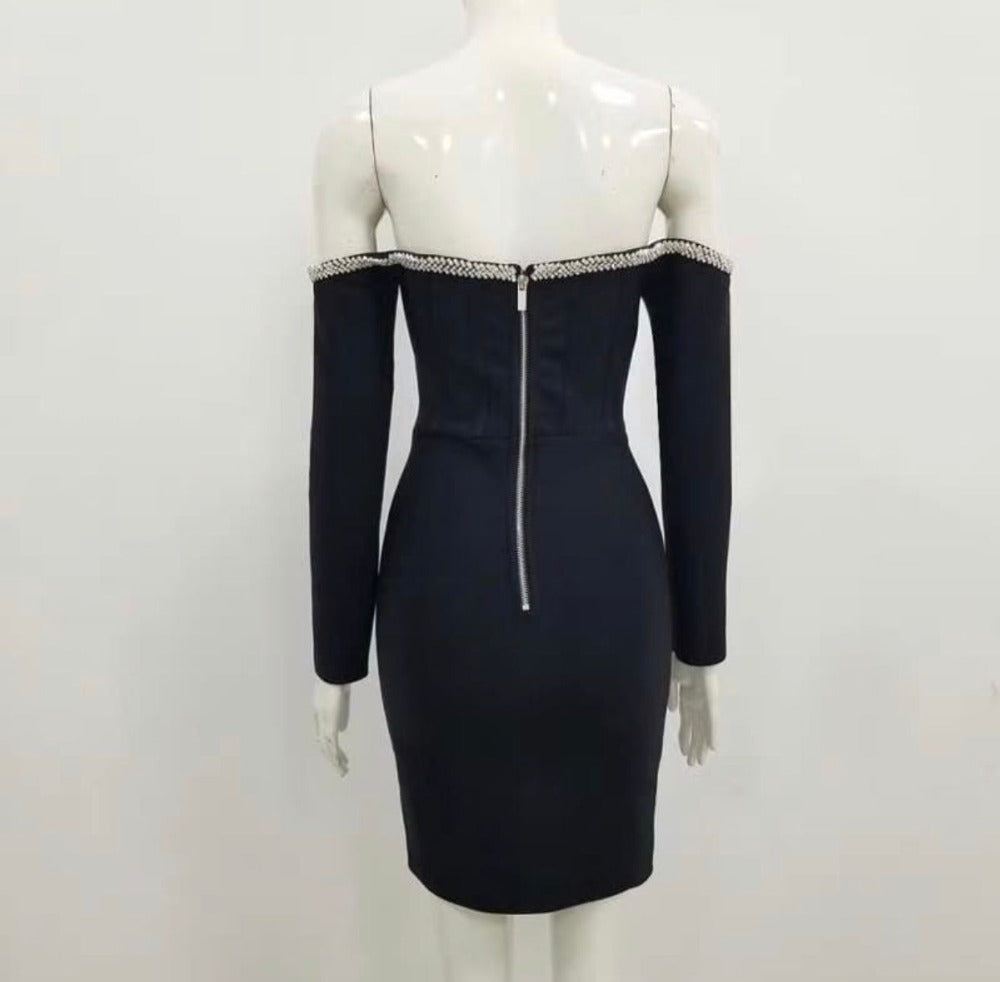 Black Off The Shoulder Long Sleeve Rayon Bandage Dress
