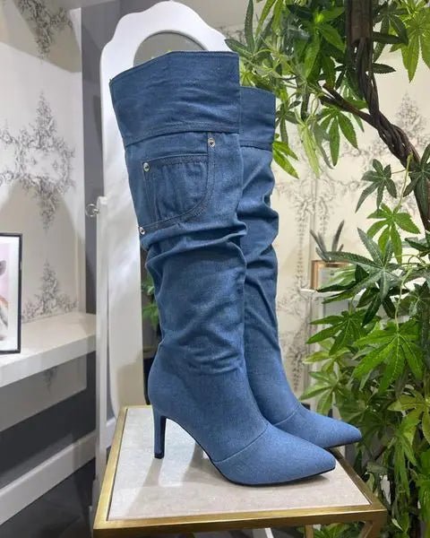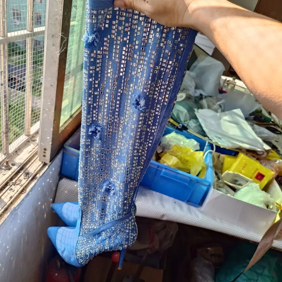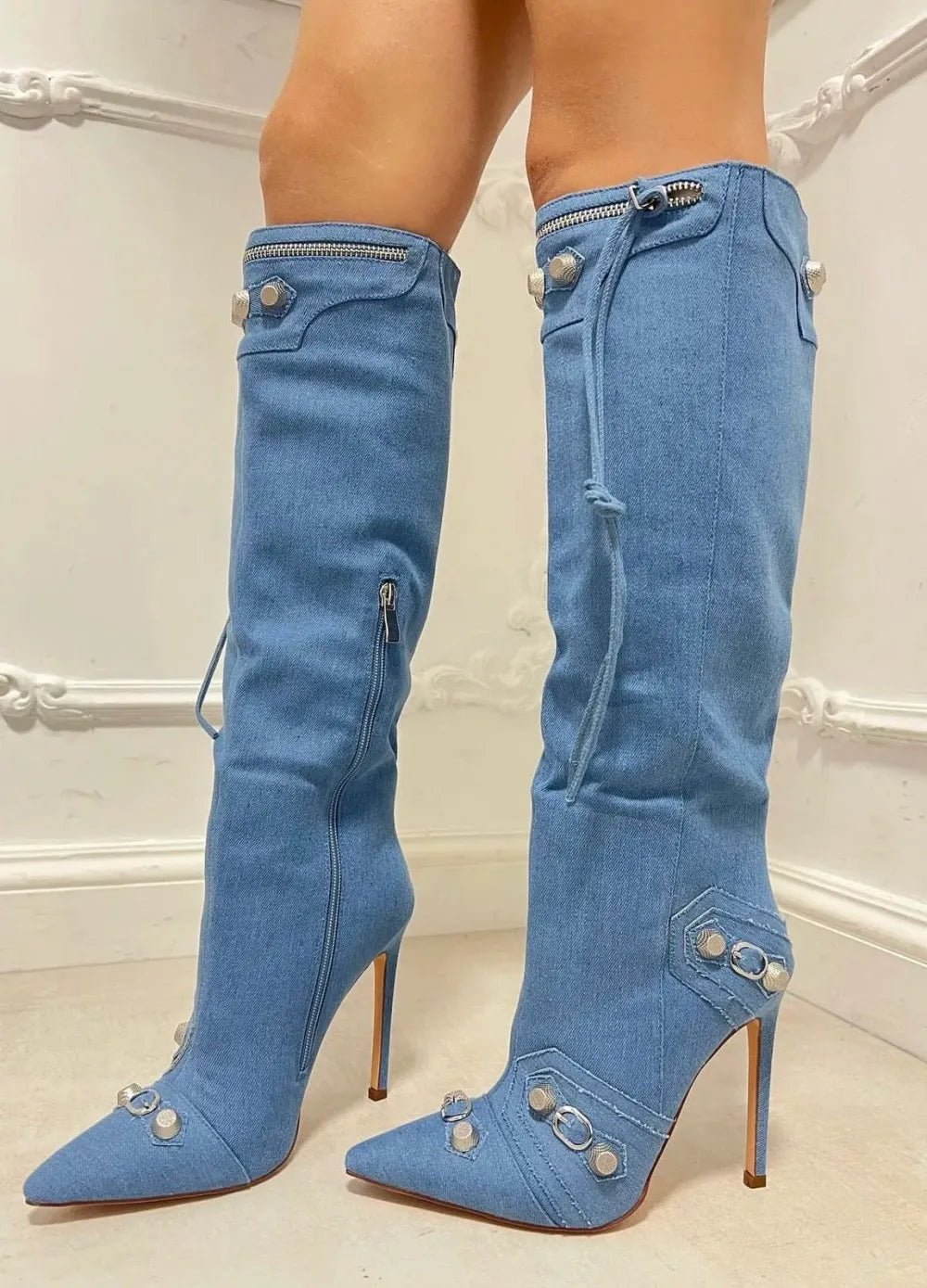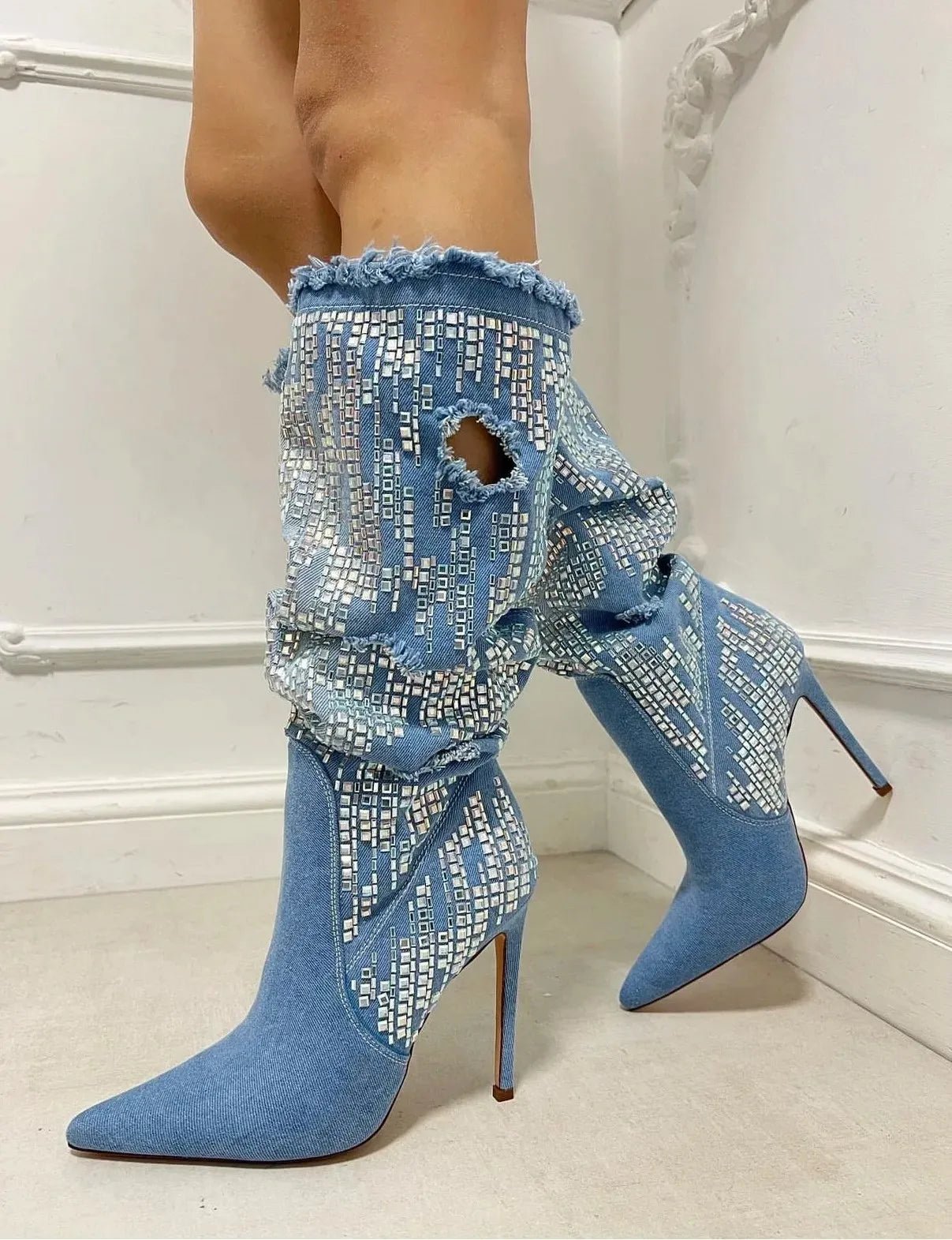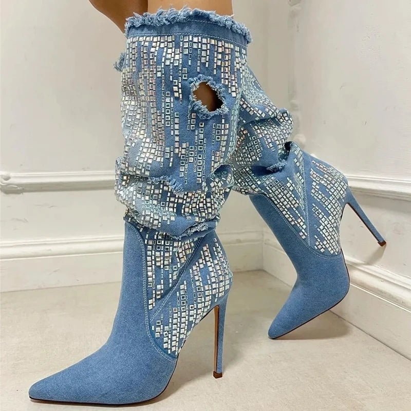 These standout knee-high boots are crafted from blue denim, featuring a unique cut-out circular pattern with mosaic-style square details on the side. Accentuated by silver sequins, they add a touch of sparkle to the design. The high stiletto heel, matching the denim hue, completes the look with elegance and flair.