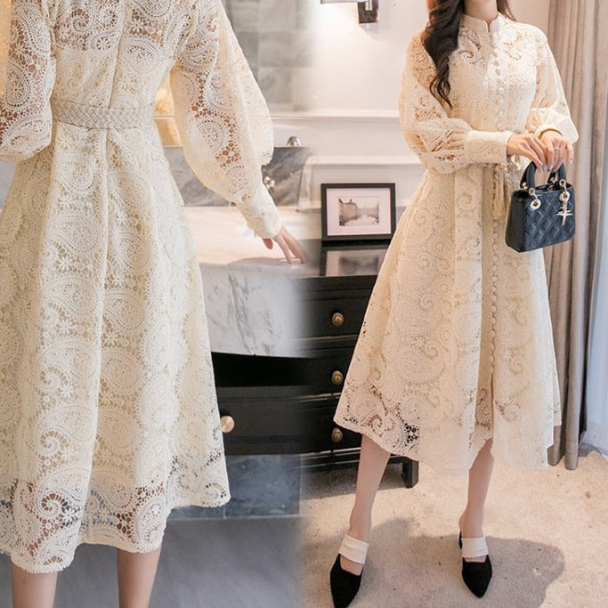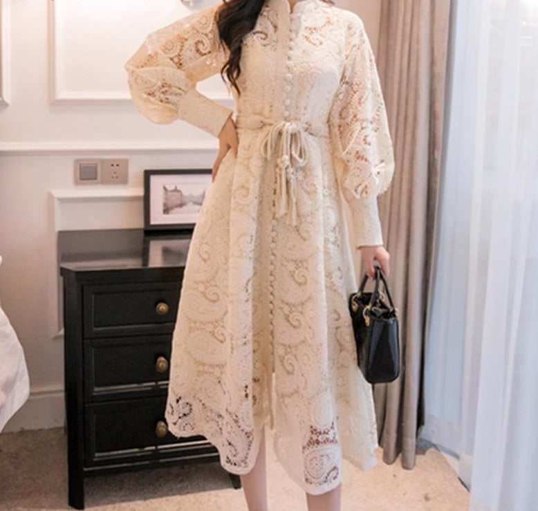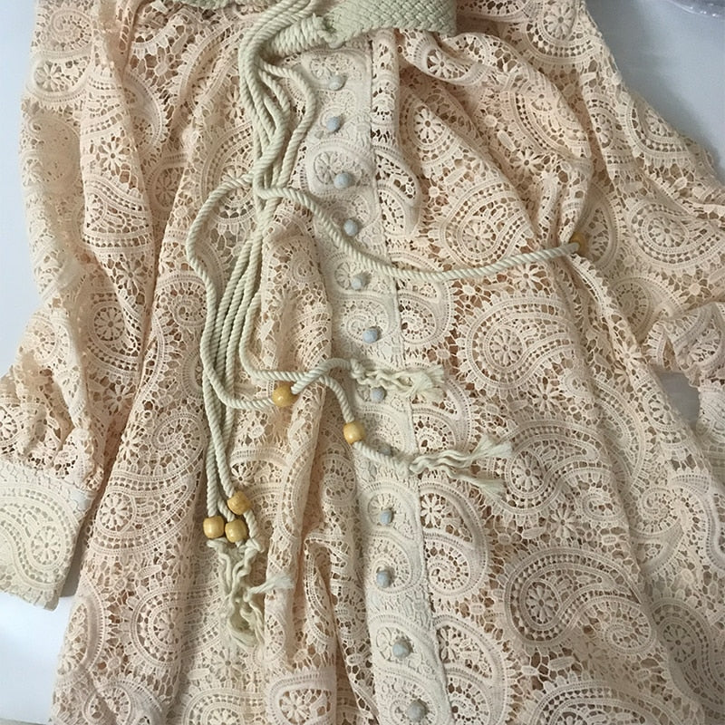 Braided belt high waist woman's dress hollow out embroidery long-sleeve